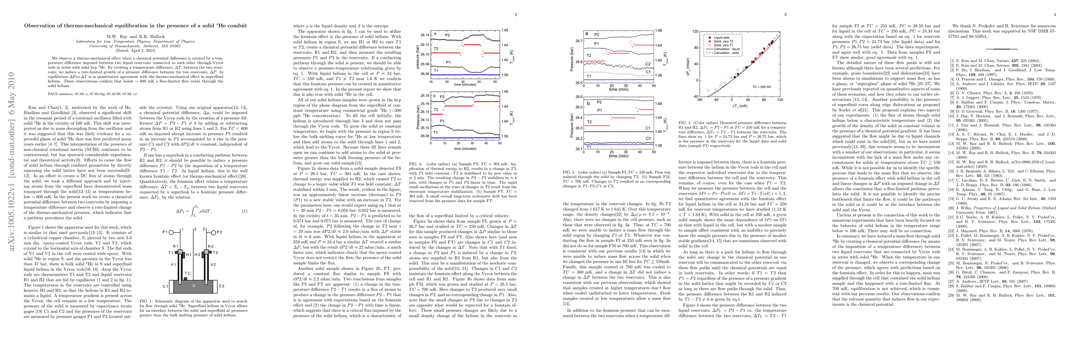 This study observes a thermo-mechanical effect in liquid helium conduits, where a temperature difference induces a pressure difference, confirming the flux-limited flow through solid hcp 4He below 600 mK. The equilibrium relationship between $\Delta P$ and $\Delta T$ aligns with predictions for superfluid helium.