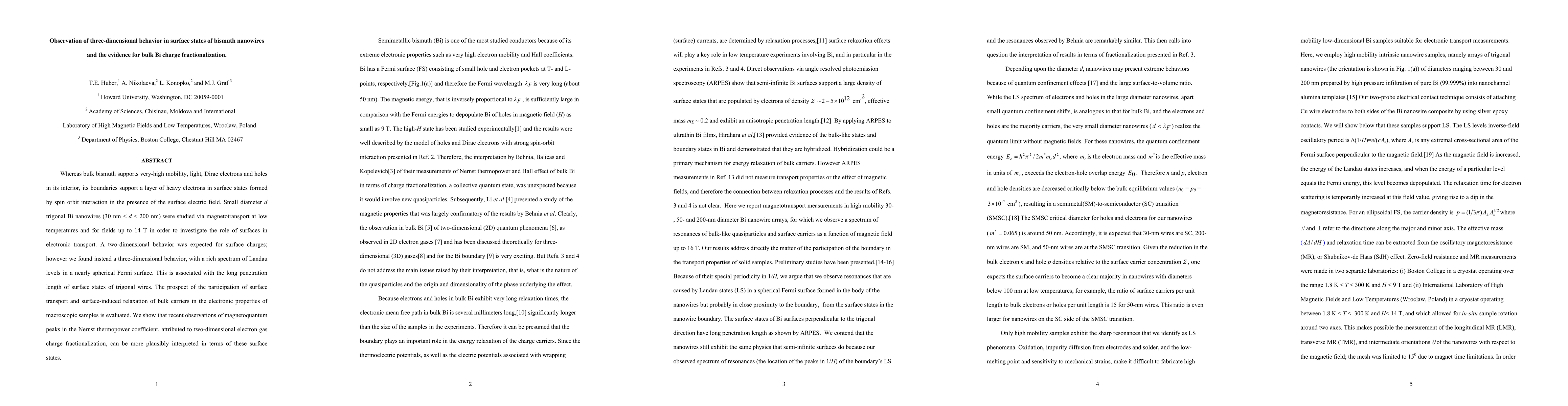 Whereas bulk bismuth supports very-high mobility, light, Dirac electrons and holes in its interior, its boundaries support a layer of heavy electrons in surface states formed by spin orbit interaction in the presence of the surface electric field. Small diameter d trigonal Bi nanowires (30 nm < d < 200 nm) were studied via magnetotransport at low temperatures and for fields up to 14 T in order to investigate the role of surfaces in electronic transport. A two-dimensional behavior was expected for surface charges; however we found instead a three-dimensional behavior, with a rich spectrum of Landau levels in a nearly spherical Fermi surface. This is associated with the long penetration length of surface states of trigonal wires. The prospect of the participation of surface transport and surface-induced relaxation of bulk carriers in the electronic properties of macroscopic samples is evaluated. We show that recent observations of magnetoquantum peaks in the Nernst thermopower coefficient, attributed to two-dimensional electron gas charge fractionalization, can be more plausibly interpreted in terms of these surface states.