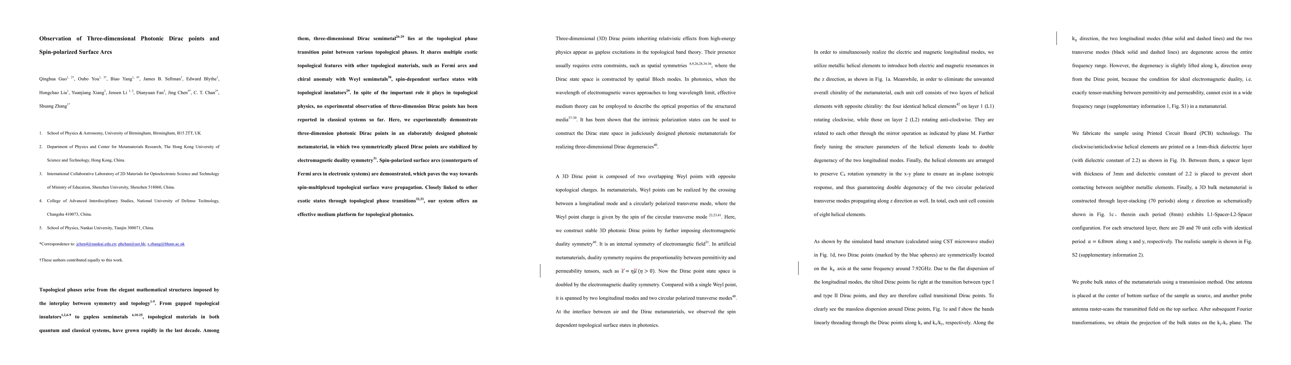 This research experimentally observes three-dimensional photonic Dirac points and spin-polarized surface arcs in a photonic metamaterial, marking the first classical system demonstration of such topological features. This paves the way for spin-multiplexed topological surface wave propagation.