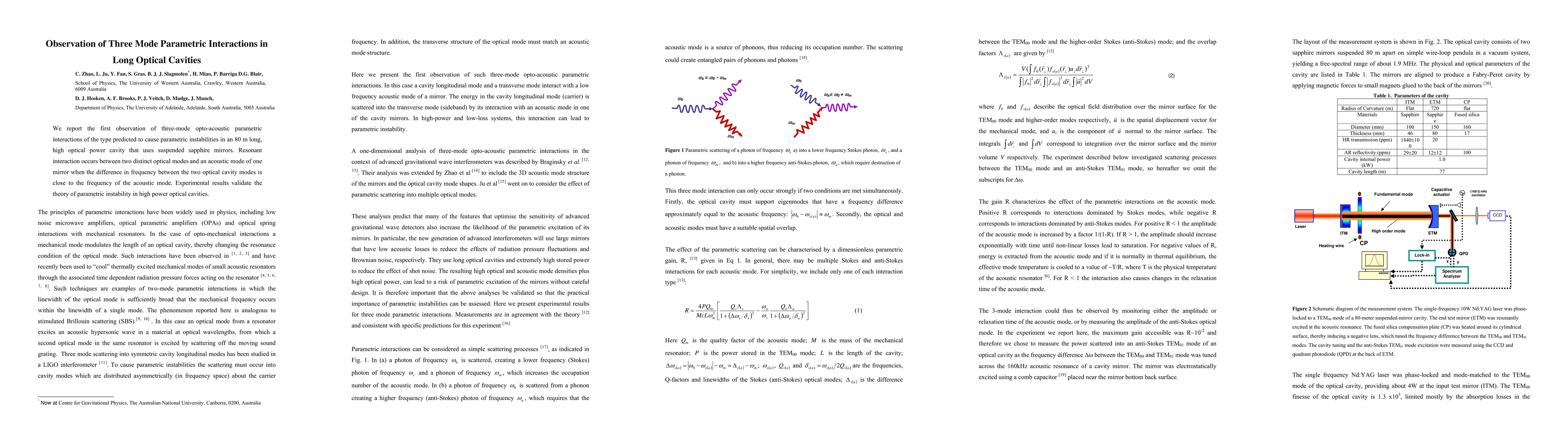 This research is significant as it demonstrates the first observation of three-mode parametric interactions in long optical cavities, which could potentially lead to applications in quantum information, teleportation, and quantum encryption by serving as a source of phonon-photon entanglement.