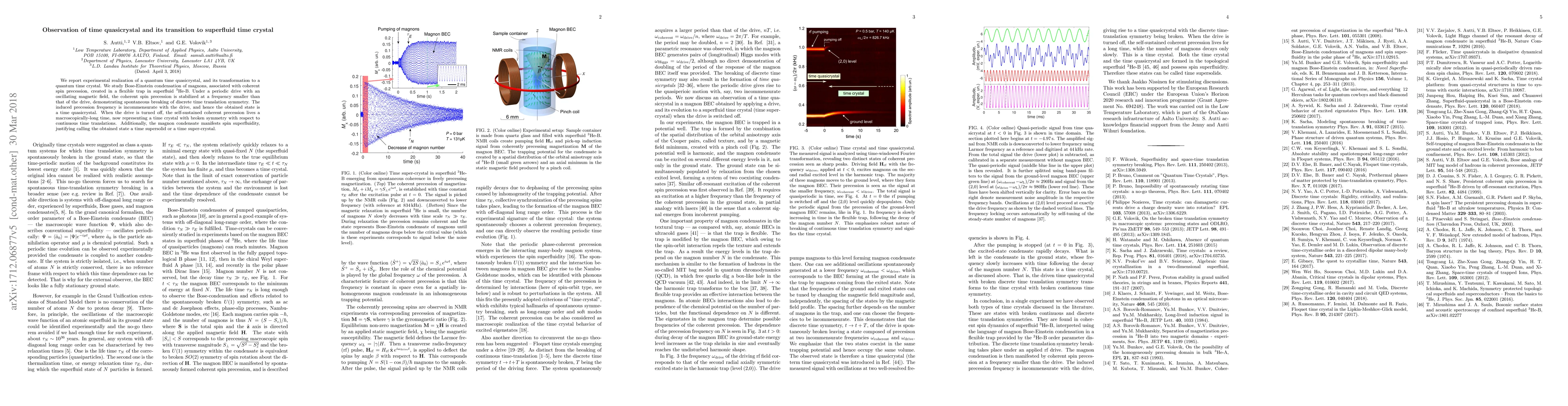 We report experimental realization of a quantum time quasicrystal, and its transformation to a quantum time crystal. We study Bose-Einstein condensation of magnons, associated with coherent spin precession, created in a flexible trap in superfluid $^3$He-B. Under a periodic drive with an oscillating magnetic field, the coherent spin precession is stabilized at a frequency smaller than that of the drive, demonstrating spontaneous breaking of discrete time translation symmetry. The induced precession frequency is incommensurate with the drive, and hence the obtained state is a time quasicrystal. When the drive is turned off, the self-sustained coherent precession lives a macroscopically-long time, now representing a time crystal with broken symmetry with respect to continuous time translations. Additionally, the magnon condensate manifests spin superfluidity, justifying calling the obtained state a time supersolid or a time super-crystal.