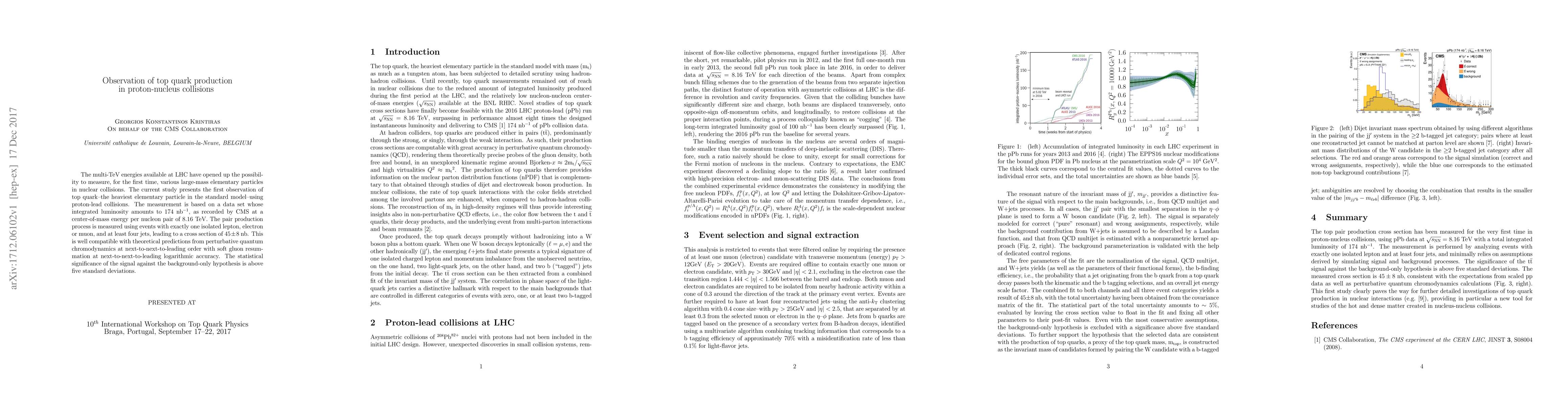 The multi-TeV energies available at LHC have opened up the possibility to measure, for the first time, various large-mass elementary particles in nuclear collisions. The current study presents the first observation of top quark--the heaviest elementary particle in the standard model--using proton-lead collisions. The measurement is based on a data set whose integrated luminosity amounts to 174 nb$^{-1}$, as recorded by CMS at a center-of-mass energy per nucleon pair of 8.16 TeV. The pair production process is measured using events with exactly one isolated lepton, electron or muon, and at least four jets, leading to a cross section of $45\pm8\ \rm{nb}$. This is well compatible with theoretical predictions from perturbative quantum chromodynamics at next-to-next-to-leading order with soft gluon resummation at next-to-next-to-leading logarithmic accuracy. The statistical significance of the signal against the background-only hypothesis is above five standard deviations.