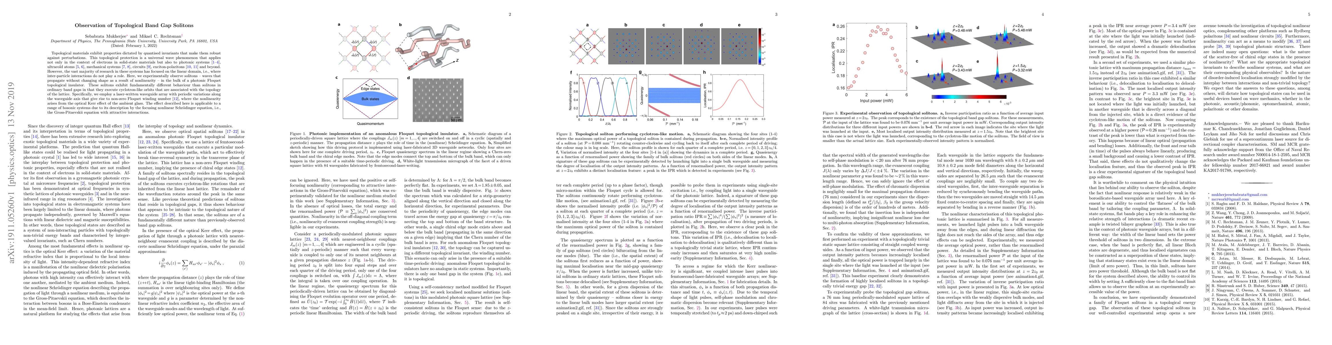 This paper experimentally observes topological solitons in a photonic Floquet topological insulator, showing unique cyclotron-like orbits tied to the material's topology. The study demonstrates solitons in the nonlinear regime, applicable to various bosonic systems through the focusing nonlinear Schrödinger equation.