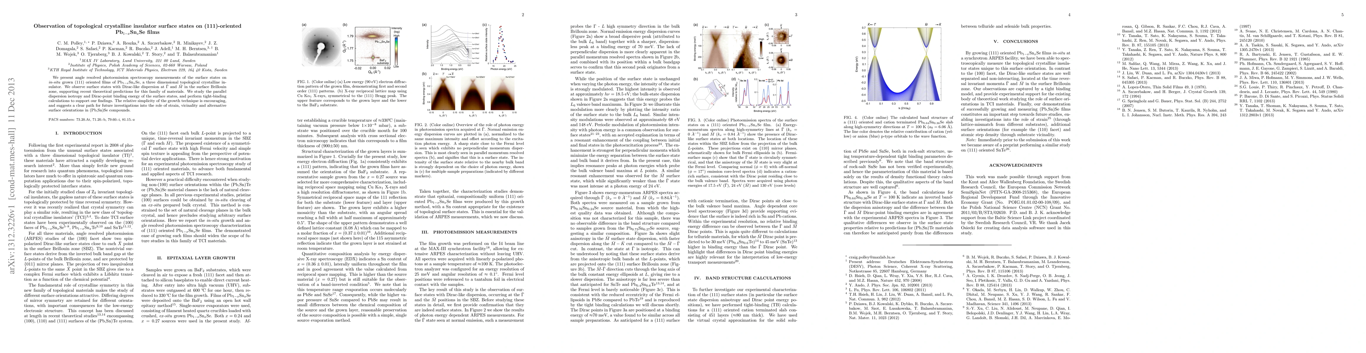This study uses angle resolved photoemission spectroscopy to investigate surface states on (111)-oriented Pb$_{1-x}$Sn$_{x}$Se films, identifying Dirac-like dispersions that align with theoretical predictions for topological crystalline insulators. Tight-binding calculations corroborate these observations, highlighting potential for future research into strain and alternative orientations in these materials.