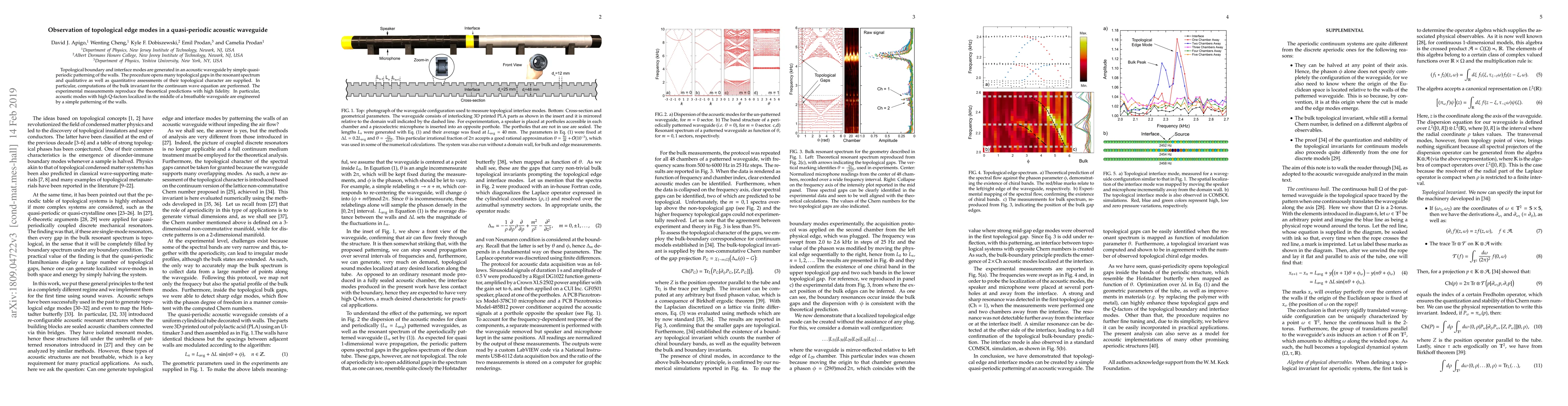 This research observes topological edge modes in a quasi-periodic acoustic waveguide, demonstrating the generation of boundary and interface modes through patterned wall designs. Experimental measurements align closely with theoretical predictions, showcasing engineered acoustic modes with high Q-factors.