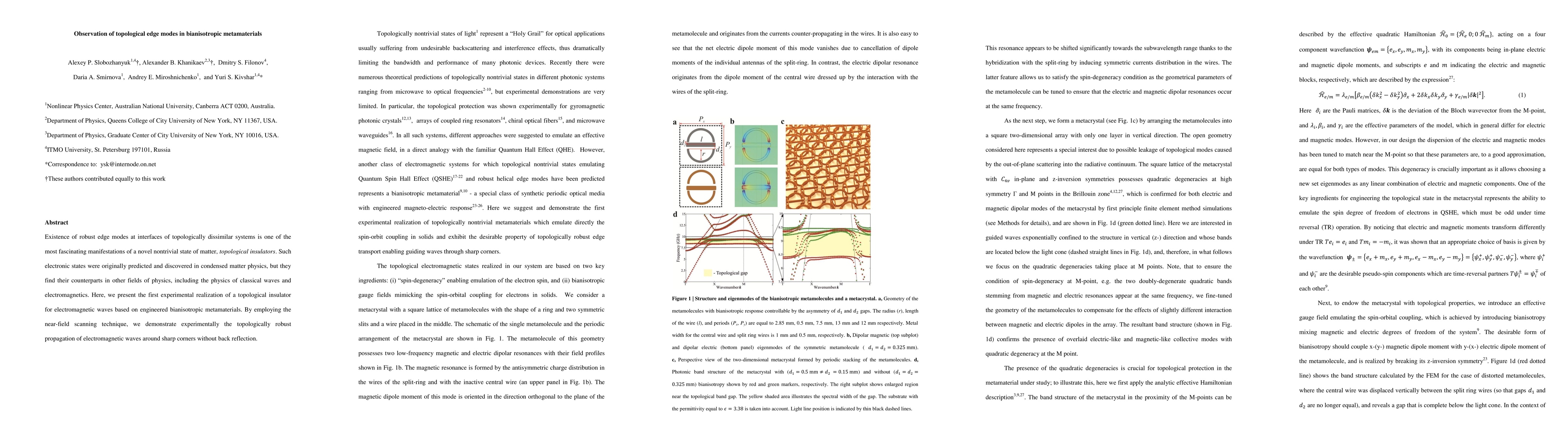 This paper reports the first experimental observation of topological edge modes in engineered bianisotropic metamaterials, demonstrating robust electromagnetic wave propagation around sharp corners without reflection, mirroring the behavior seen in topological insulators in condensed matter physics.