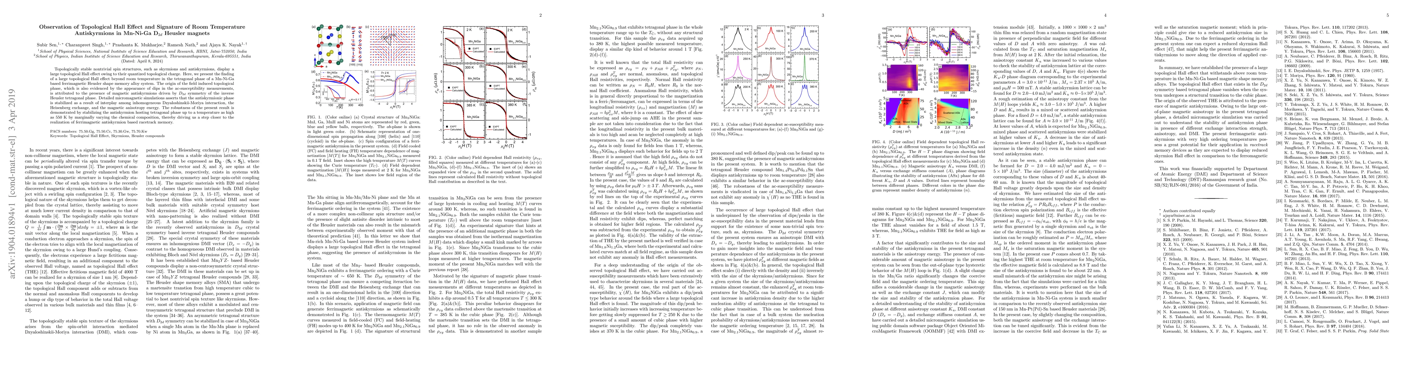 This paper reports the observation of a large topological Hall effect in Mn-Ni-Ga Heusler magnets, attributing it to the presence of room temperature antiskyrmions driven by the D2d symmetry. The stability of the antiskyrmionic phase is achieved through a combination of Dzyaloshinskii-Moriya interaction, Heisenberg exchange, and magnetic anisotropy, with the phase maintained up to 550 K by compositional adjustments.