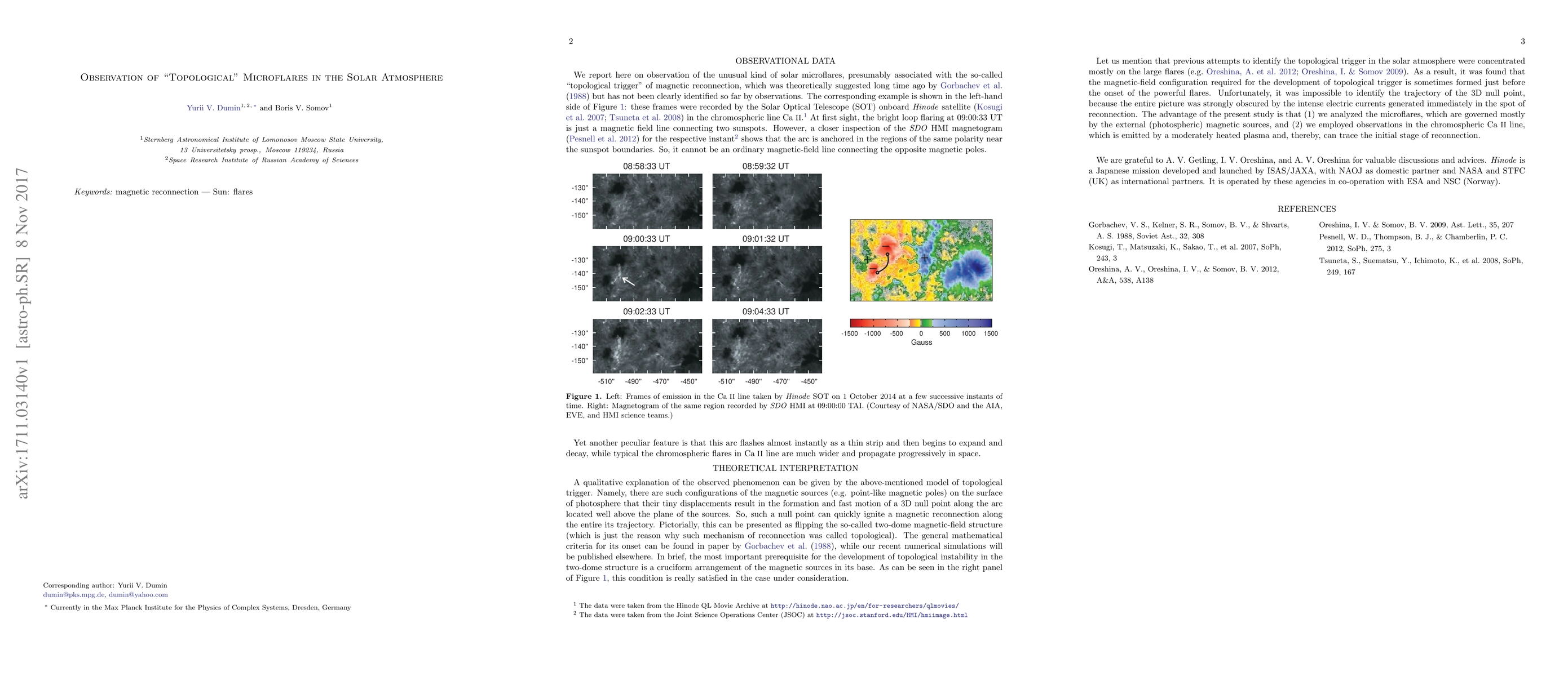 We report on observation of the unusual kind of solar microflares, presumably associated with the so-called "topological trigger" of magnetic reconnection, which was theoretically suggested long time ago by Gorbachev et al. (Sov. Ast. 1988, v.32, p.308) but has not been clearly identified so far by observations. As can be seen in pictures by Hinode SOT in CaII line, there may be a bright loop connecting two sunspots, which looks at the first sight just as a magnetic field line connecting the opposite poles. However, a closer inspection of SDO HMI magnetograms shows that the respective arc is anchored in the regions of the same polarity near the sunspot boundaries. Yet another peculiar feature is that the arc flashes almost instantly as a thin strip and then begins to expand and decay, while the typical chromospheric flares in CaII line are much wider and propagate progressively in space. A qualitative explanation of the unusual flare can be given by the above-mentioned model of topological trigger. Namely, there are such configurations of the magnetic sources on the surface of photosphere that their tiny displacements result in the formation and fast motion of a 3D null point along the arc located well above the plane of the sources. So, such a null point can quickly ignite a magnetic reconnection along the entire its trajectory. Pictorially, this can be presented as flipping the so-called two-dome magnetic-field structure (which is just the reason why such mechanism was called topological). The most important prerequisite for the development of topological instability in the two-dome structure is a cruciform arrangement of the magnetic sources in its base, and this condition is really satisfied in the case under consideration.