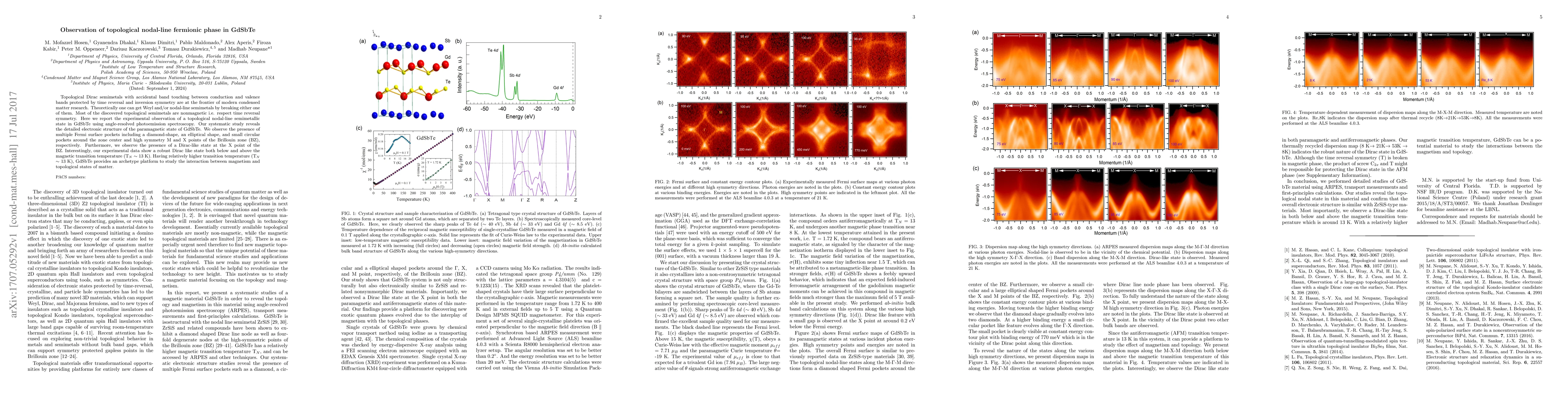 Topological Dirac semimetals with accidental band touching between conduction and valence bands protected by time reversal and inversion symmetry are at the frontier of modern condensed matter research. Theoretically one can get Weyl and/or nodal-line semimetals by breaking either one of them. Most of the discovered topological semimetals are nonmagnetic i.e respect time reversal symmetry. Here we report the experimental observation of a topological nodal-line semi metallic state in GdSbTe using angle-resolved photoemission spectroscopy. Our systematic study reveals the detailed electronic structure of the paramagnetic state of GdSbTe. We observe the presence of multiple Fermi surface pockets including a diamond-shape, an elliptical shape, and small circular pockets around the zone center and high symmetry M and X points of the Brillouin zone (BZ), respectively. Furthermore, we observe the presence of a Dirac-like state at the X point of the BZ. Interestingly, our experimental data shows a robust Dirac like state both below and above the magnetic transition temperature (T_N ~ 13 K). Having relatively higher transition temperature, GdSbTe provides an archetype platform to study the interaction between magnetism and topological states of matter.