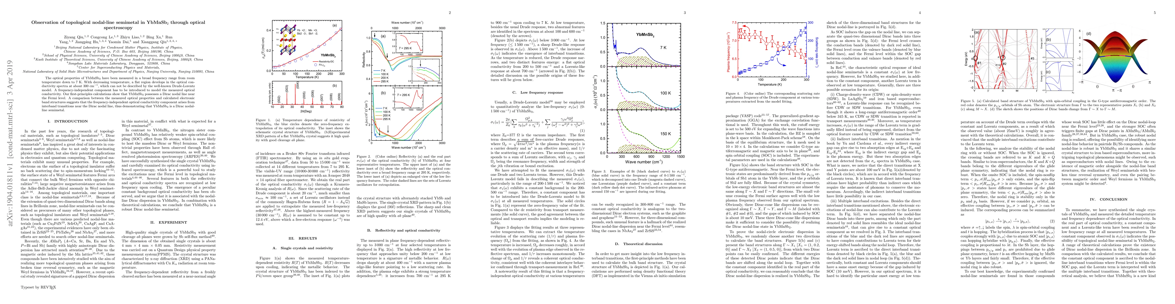 YbMnSb2 exhibits a Dirac nodal line semimetal behavior, as evidenced by optical spectroscopy showing a flat region in optical conductivity spectra at around 300 cm-1, attributable to interband transitions near the nodal line, confirmed by first-principles calculations.