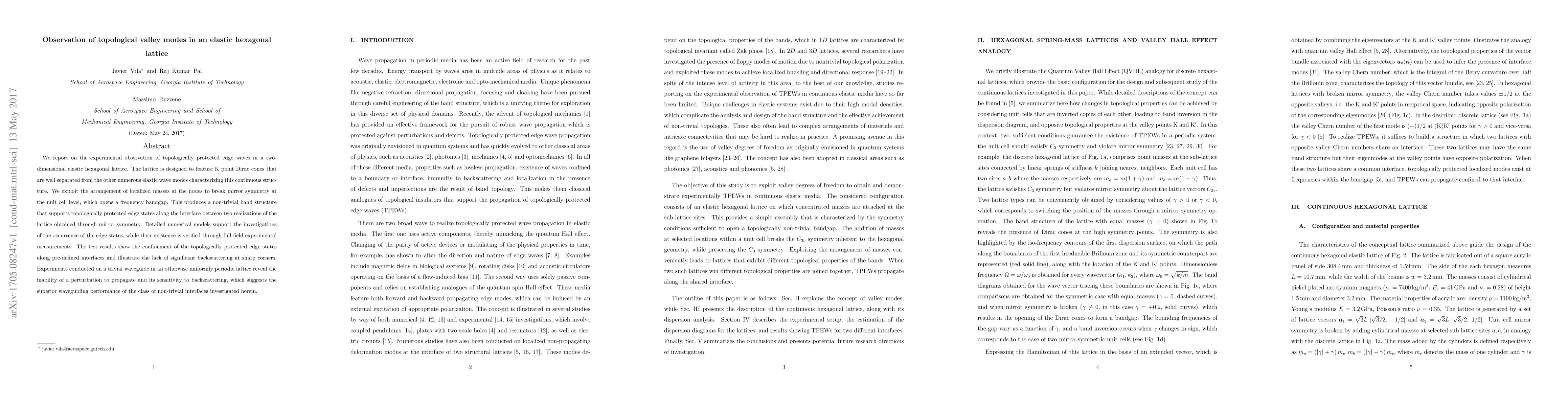 We report on the experimental observation of topologically protected edge waves in a two-dimensional elastic hexagonal lattice. The lattice is designed to feature K point Dirac cones that are well separated from the other numerous elastic wave modes characterizing this continuous structure. We exploit the arrangement of localized masses at the nodes to break mirror symmetry at the unit cell level, which opens a frequency bandgap. This produces a non-trivial band structure that supports topologically protected edge states along the interface between two realizations of the lattice obtained through mirror symmetry. Detailed numerical models support the investigations of the occurrence of the edge states, while their existence is verified through full-field experimental measurements. The test results show the confinement of the topologically protected edge states along pre-defined interfaces and illustrate the lack of significant backscattering at sharp corners. Experiments conducted on a trivial waveguide in an otherwise uniformly periodic lattice reveal the inability of a perturbation to propagate and its sensitivity to backscattering, which suggests the superior waveguiding performance of the class of non-trivial interfaces investigated herein.