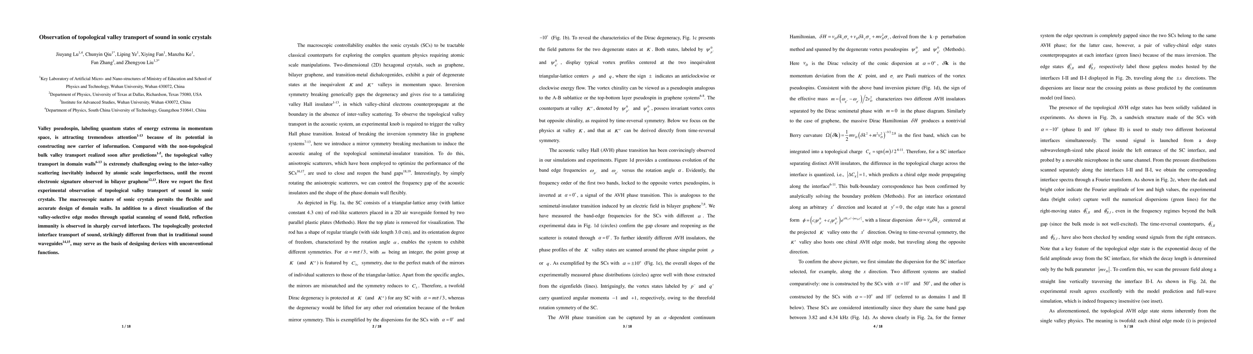 This paper reports the first experimental observation of topological valley transport of sound in sonic crystals, demonstrating valley-selective edge modes and reflection immunity in sharply curved interfaces. The findings suggest potential for designing devices with unique functionalities based on topologically protected sound transport.