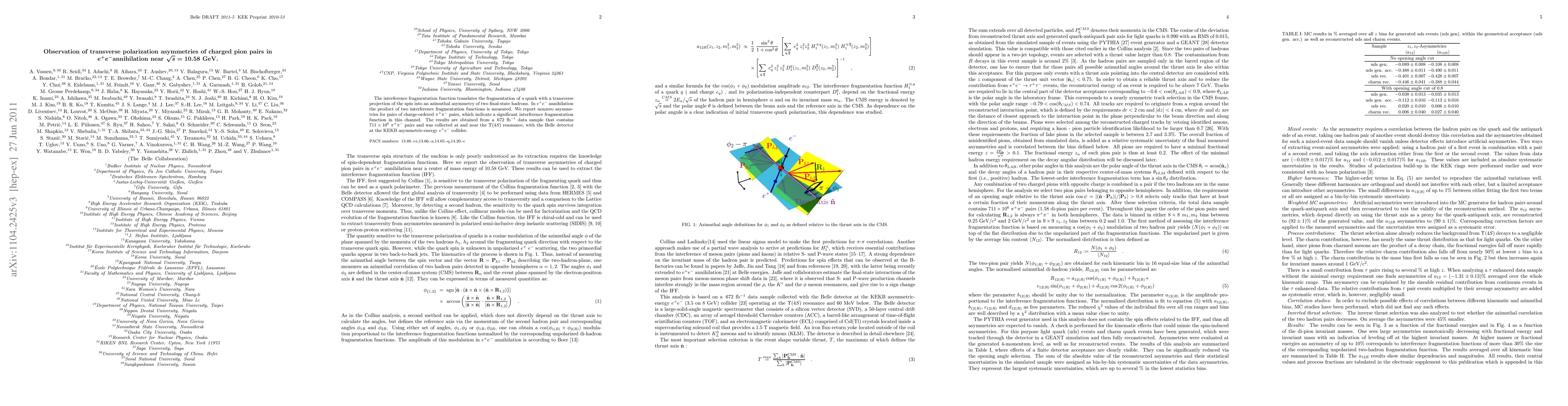 This study investigates transverse polarization asymmetries in charged pion pairs from e+e- annihilation near the ?(4S) resonance, revealing significant interference fragmentation functions. The Belle detector at KEKB collected data yielding 711 \times 10^6 pi+pi- pairs, confirming nonzero asymmetries indicative of substantial interference effects.