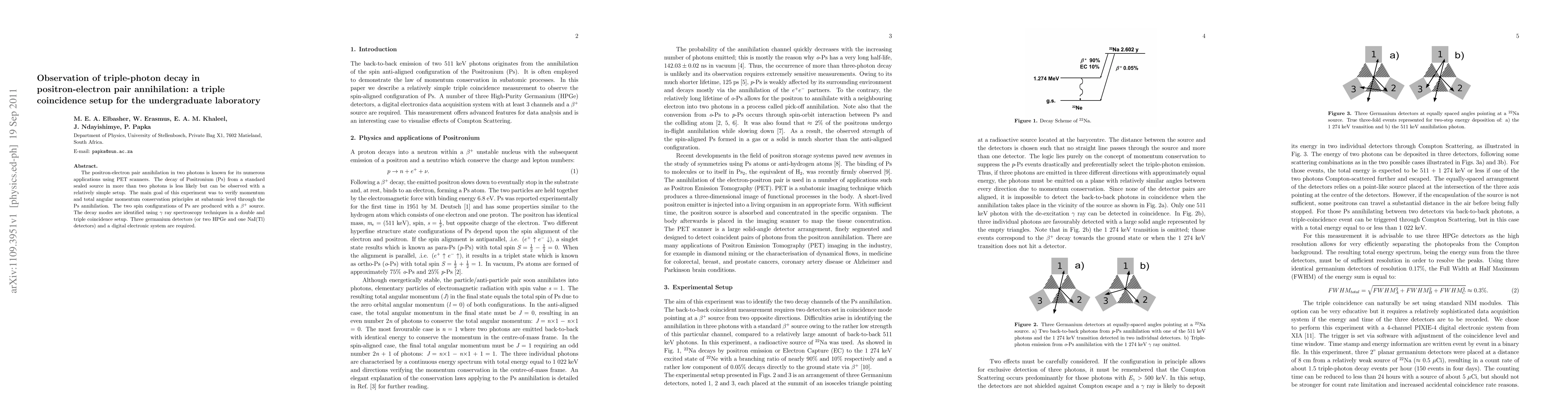 The positron-electron pair annihilation in two photons is known for its numerous applications using PET scanners. The decay of Positronium (Ps) from a standard sealed source in more than two photons is less likely but can be observed with a relatively simple setup. The main goal of this experiment was to verify momentum and total angular momentum conservation principles at subatomic level through the Ps annihilation. The two spin configurations of Ps are produced with a beta+ source. The decay modes are identified using gamma-ray spectroscopy techniques in a double and triple coincidence setup. Three germanium detectors (or two HPGe and one NaI(Tl) detectors) and a digital electronic system are required.