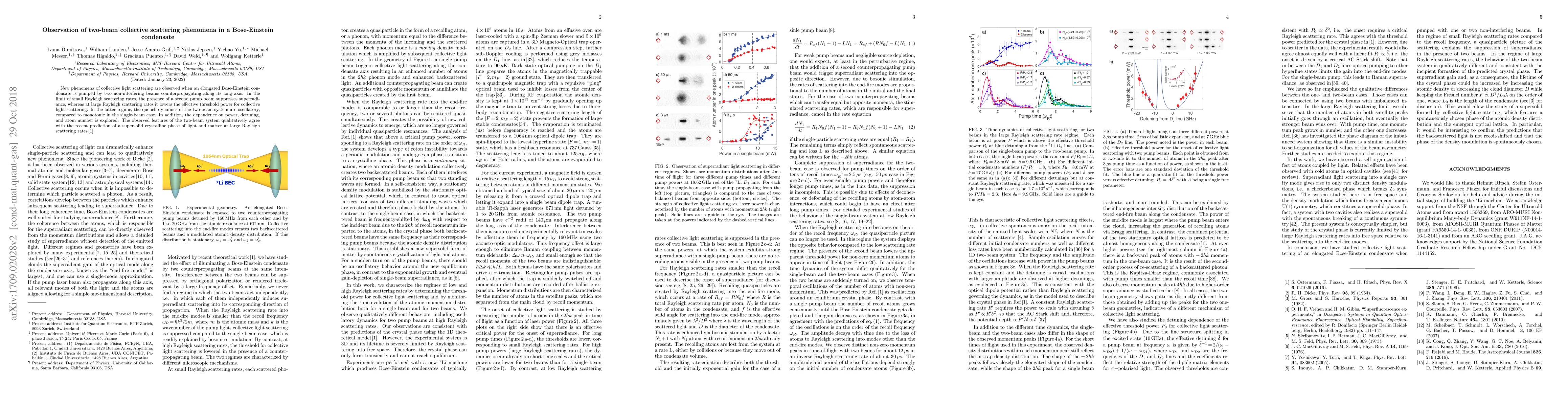 Researchers observe two-beam collective scattering phenomena in a Bose-Einstein condensate, finding that a second pump beam suppresses or lowers the threshold power for collective light scattering depending on its strength.