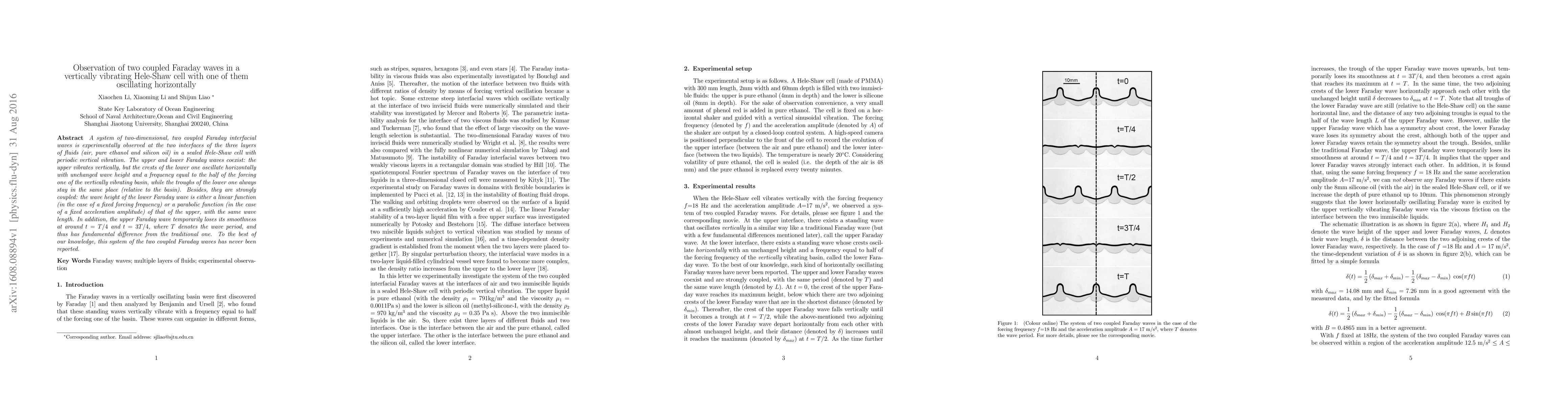 This study experimentally observes two coupled Faraday waves in a Hele-Shaw cell with periodic vertical vibration, where the upper wave oscillates vertically and the lower wave oscillates horizontally at half the forcing frequency. The lower wave's wave height is strongly coupled to the upper wave's, differing from traditional Faraday waves by temporarily losing smoothness at specific times.