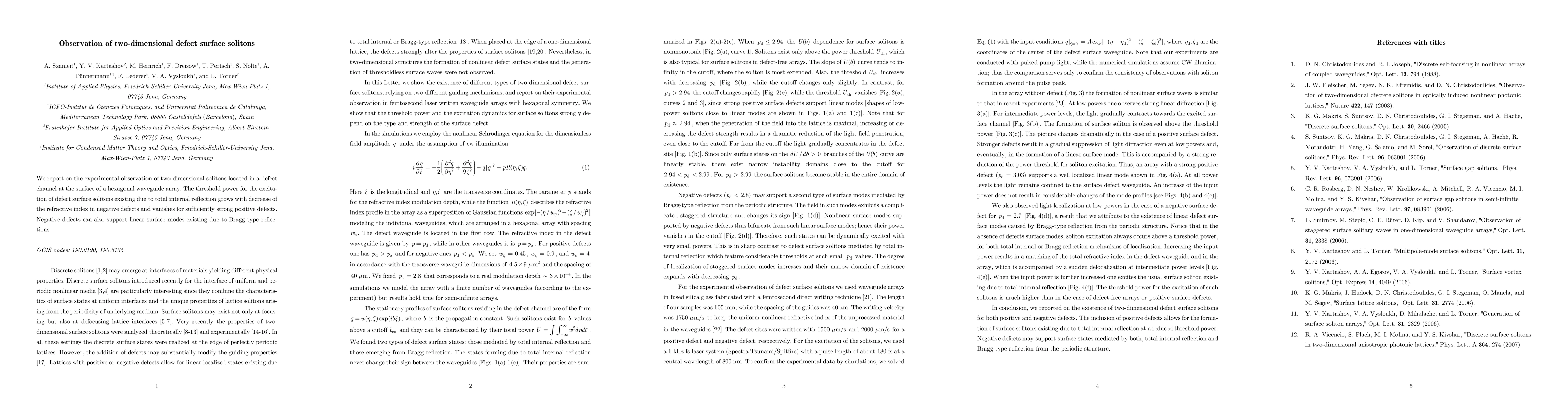 This paper reports the experimental observation of two-dimensional solitons in a defect channel at the surface of a hexagonal waveguide array, noting that the threshold power for soliton excitation increases with decreasing refractive index in negative defects and vanishes in sufficiently strong positive defects. Negative defects also support linear surface modes via Bragg-type reflections.