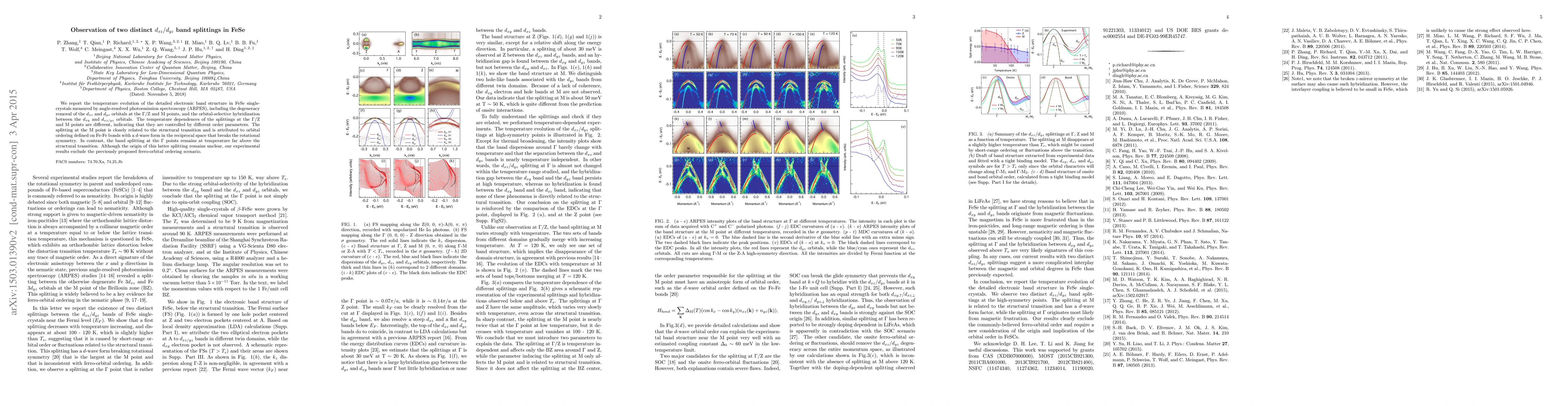 This study reveals distinct $d_{xz}/d_{yz}$ band splittings in FeSe, observed via ARPES, with different temperature dependencies indicating different control by order parameters. The M point splitting correlates with structural transition and is attributed to $d$-wave orbital ordering, while the $\Gamma$ point splitting persists above the transition and excludes ferro-orbital ordering.
