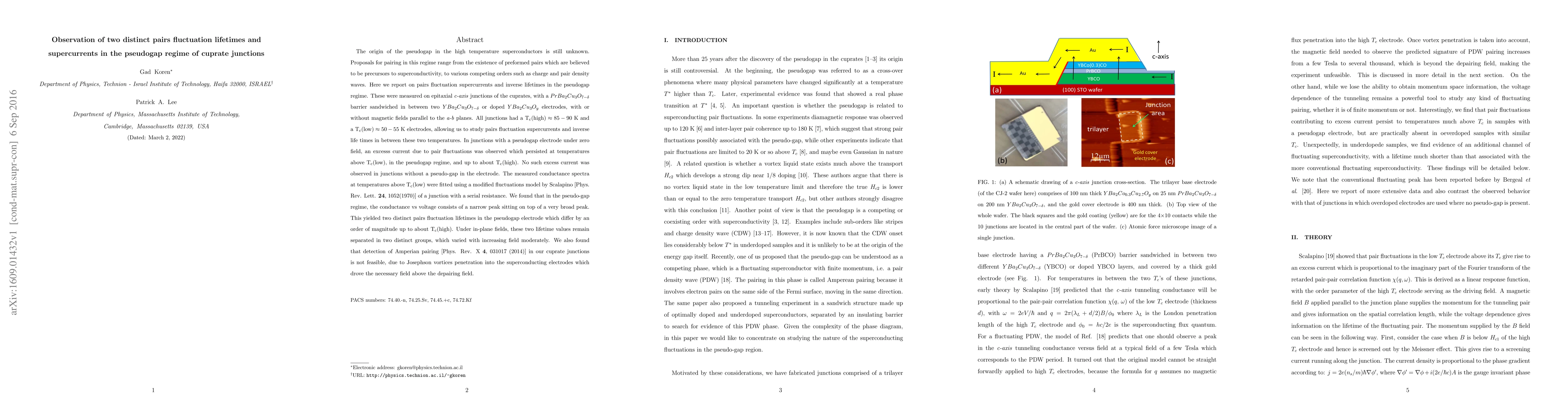 Pairs fluctuation supercurrents and inverse lifetimes were measured on epitaxial c-axis junctions of the cuprates in the pseudogap regime, with a $PrBa_2Cu_3O_{7-\delta}$ barrier sandwiched in between two $YBa_2Cu_3O_{7-\delta}$ or doped $YBa_2Cu_3O_y$ electrodes, with or without magnetic fields parallel to the a-b planes. All junctions had a $\rm T_c(high)\approx 85-90$ K and a $\rm T_c(low)\approx 50-55$ K electrodes, allowing us to study pairs fluctuation supercurrents and inverse life times in between these two temperatures. In junctions with a pseudogap electrode under zero field, an excesss current due to pair fluctuations was observed which persisted at temperatures above $\rm T_c(low)$, in the pseudogap regime, and up to about $\rm T_c(high)$. No such excess current was observed in junctions without a pseudo-gap in the electrode. The measured conductance spectra at temperatures above $\rm T_c(low)$ were fitted using a modified fluctuations model by Scalapino [Phys. Rev. Lett. \textbf{24}, 1052(1970)] of a junction with a serial resistance. We found that in the pseudo-gap regime, the conductance vs voltage consists of a narrow peak sitting on top of a very broad peak. This yielded two distinct pairs fluctuation lifetimes in the pseudogap electrode which differ by an order of magnitude up to about $\rm T_c(high)$. Under in-plane fields, these two lifetime values remain separated in two distinct groups, which varied with increasing field moderately. We also found that detection of Amperian pairing [Phys. Rev. X \textbf{4}, 031017 (2014)] in our cuprate junctions is not feasible, due to Josephson vortices penetration into the superconducting electrodes which drove the necessary field above the depairing field.
