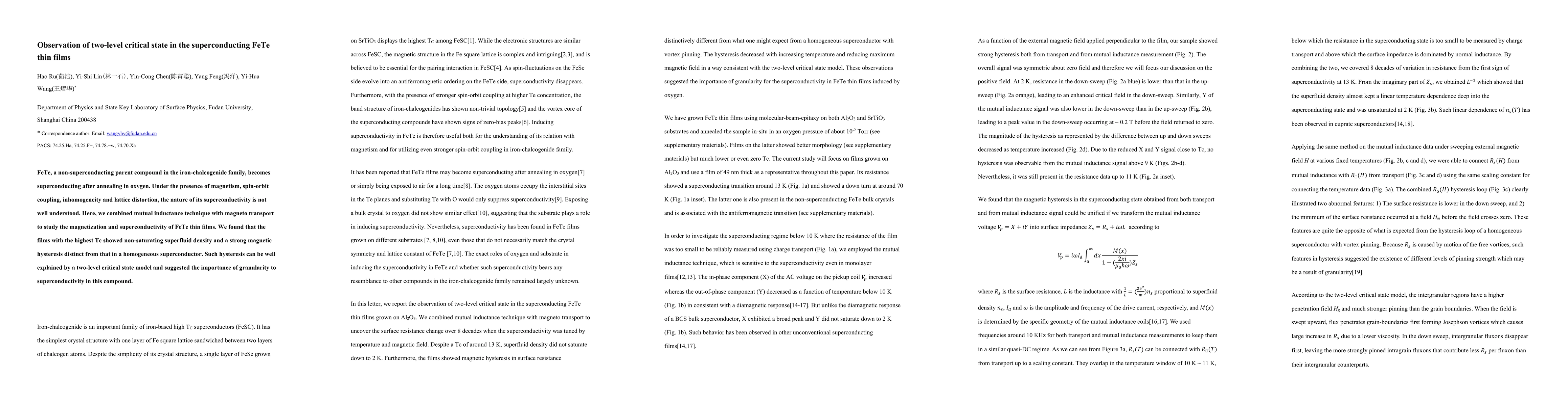 FeTe, a non-superconducting parent compound in the iron-chalcogenide family, becomes superconducting after annealing in oxygen. Under the presence of magnetism, spin-orbit coupling, inhomogeneity and lattice distortion, the nature of its superconductivity is not well understood. Here, we combined mutual inductance technique with magneto transport to study the magnetization and superconductivity of FeTe thin films. We found that the films with the highest Tc showed non-saturating superfluid density and a strong magnetic hysteresis distinct from that in a homogeneous superconductor. Such hysteresis can be well explained by a two-level critical state model and suggested the importance of granularity to superconductivity in this compound.