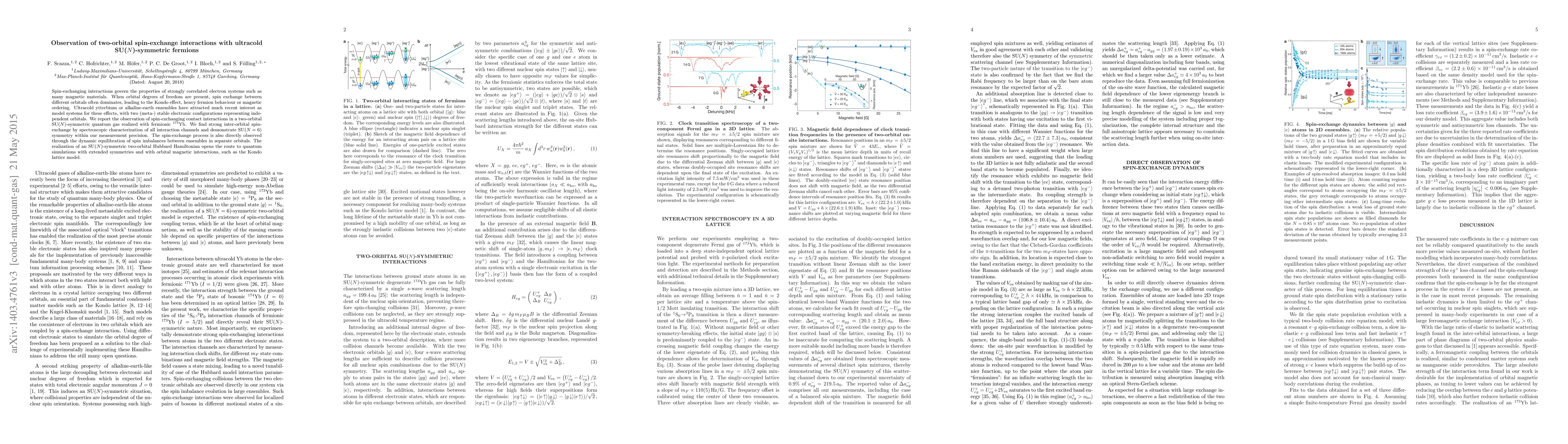 This paper reports the direct observation of spin-exchanging interactions in a two-orbital SU(N)-symmetric quantum gas of ytterbium atoms, characterized by clock shift spectroscopy, revealing strong spin-exchange mediated by contact interactions and opening pathways for quantum simulation of condensed-matter models.