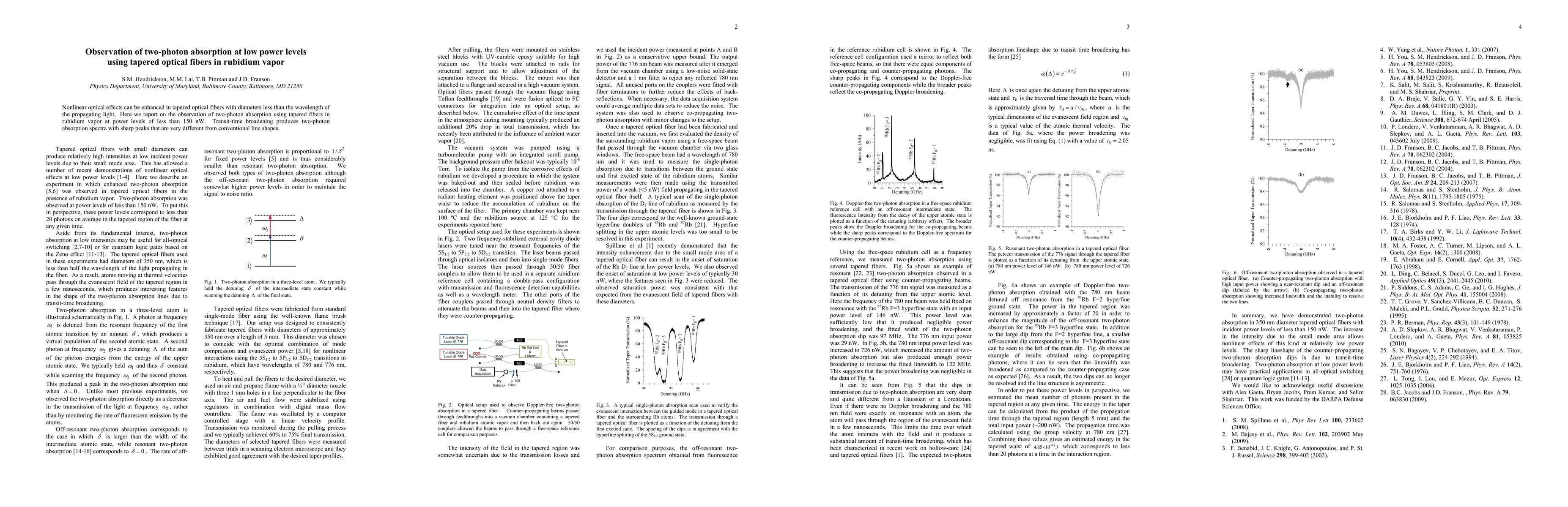 This study observes two-photon absorption in rubidium vapor using tapered optical fibers at low power levels below 150 nW, demonstrating enhanced nonlinear effects and unique spectral line shapes due to transit-time broadening.