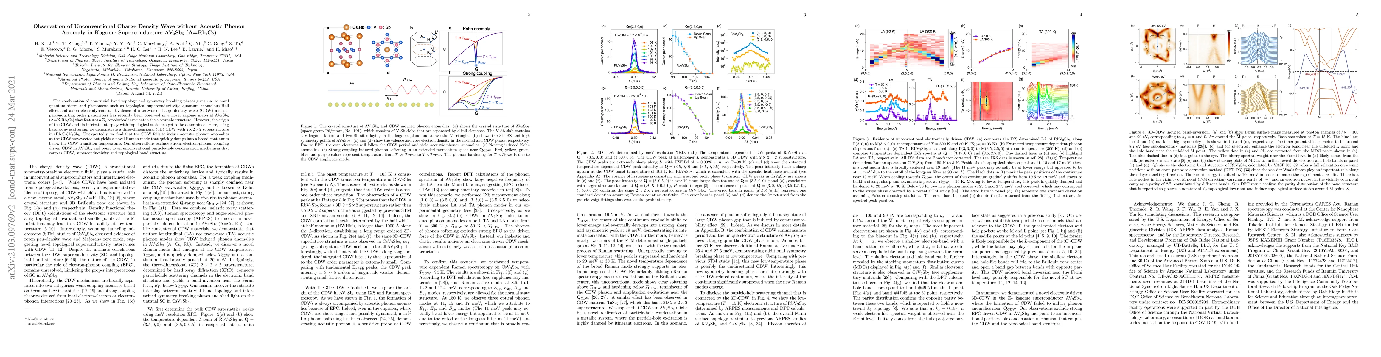 This paper reports the observation of a three-dimensional charge density wave (CDW) in kagome superconductors AV3Sb5 (A=Rb,Cs) without the expected acoustic phonon anomaly, suggesting an unconventional, electronic-driven mechanism rather than strong electron-phonon coupling. The findings highlight the intricate interplay between the CDW and the topological band structure.