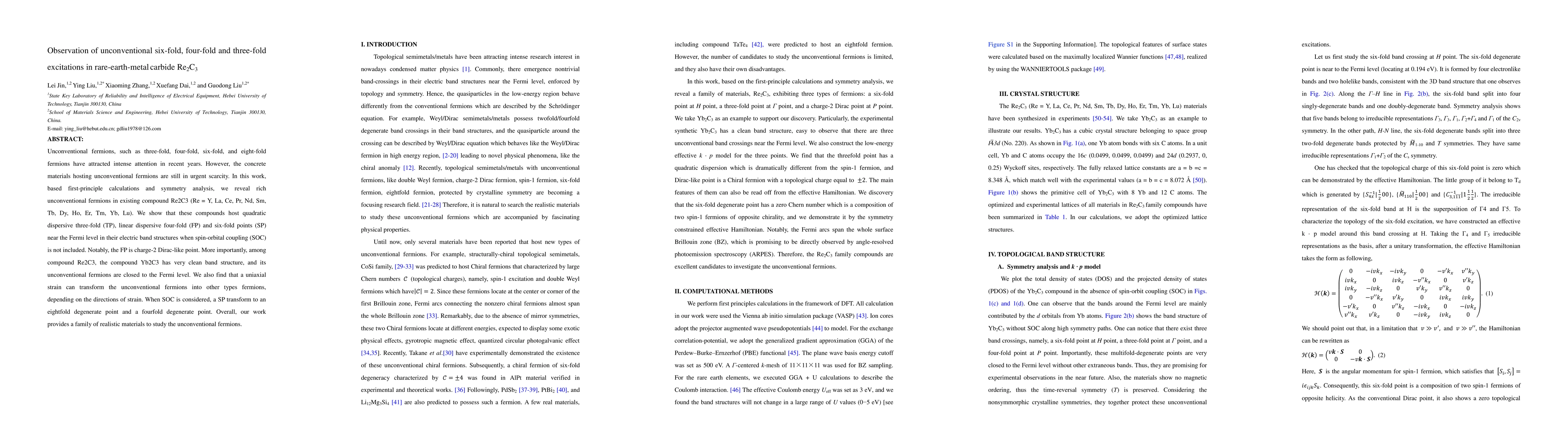 This research identifies a family of materials, Re2C3 (where Re is a rare-earth metal), as hosts for unconventional fermions, including three-fold, four-fold, and six-fold excitations. Using first-principle calculations and symmetry analysis, it shows these compounds exhibit quadratic dispersive three-fold, linear dispersive four-fold, and six-fold points near the Fermi level. Notably, Yb2C3 is highlighted for having clean band structures with these fermions close to the Fermi level, and how strain can transform these fermions into other types. With the inclusion of spin-orbital coupling, fourfold and eightfold degenerate points emerge.