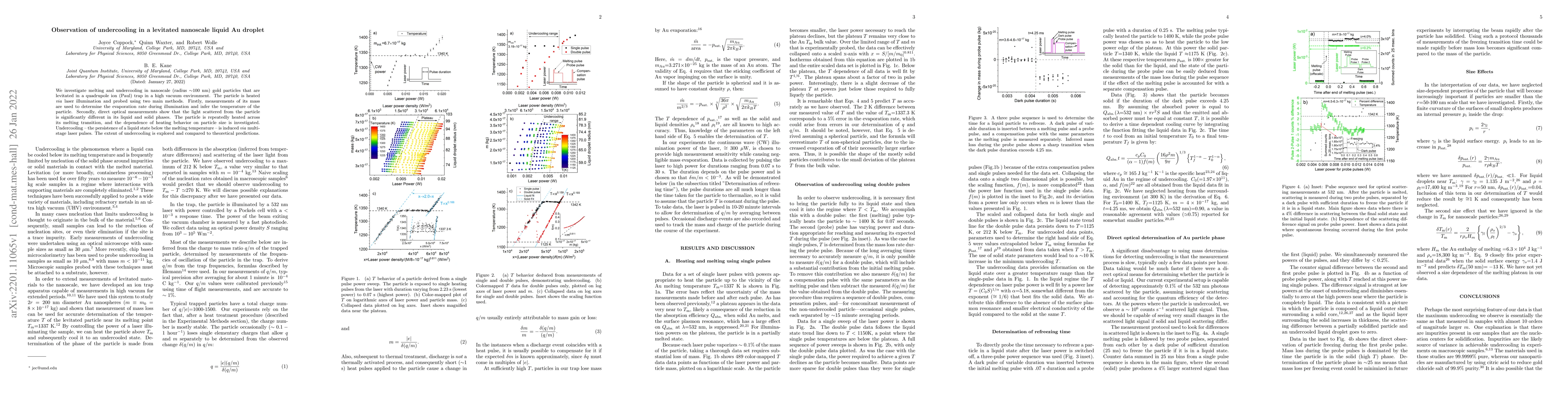 This study investigates the melting and undercooling behaviors in nanoscale gold droplets (radius ~100 nm) levitated in a vacuum using laser heating and optical scattering methods. The research reveals the extent of undercooling, where the liquid state persists below the melting temperature, and compares these findings to theoretical predictions.