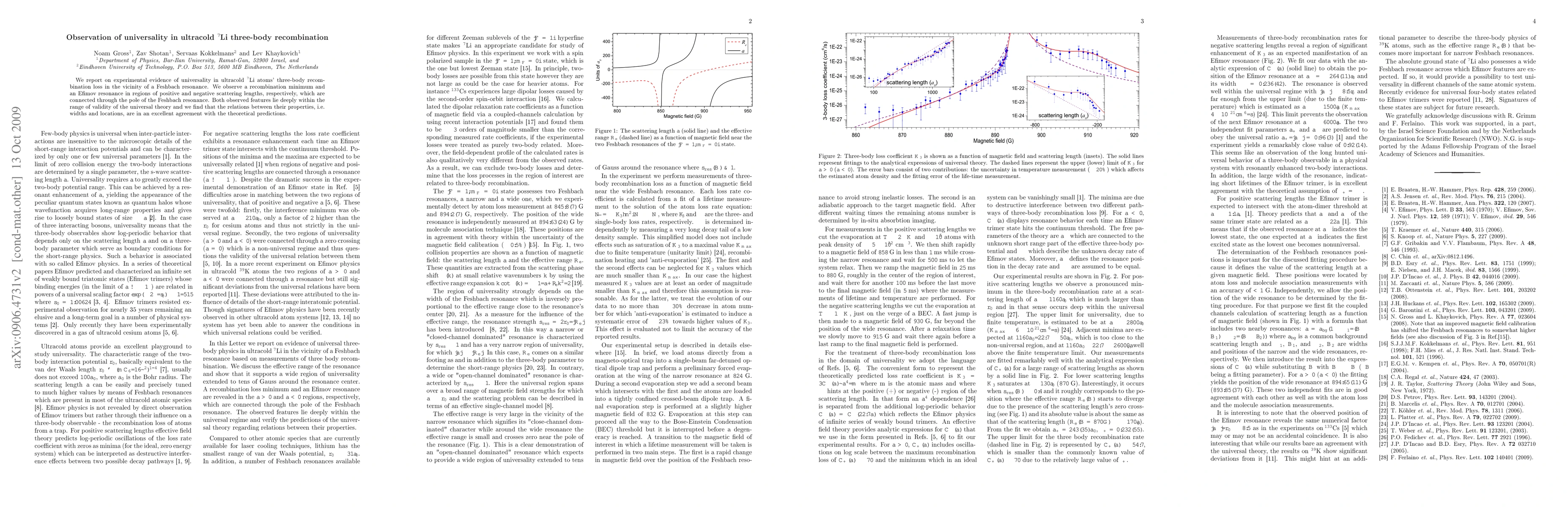 Researchers observed a universal phenomenon in 7Li atoms' three-body recombination, finding both a recombination minimum near positive scattering lengths and an Efimov resonance near negative scattering lengths, with their properties agreeing well with theoretical predictions.
