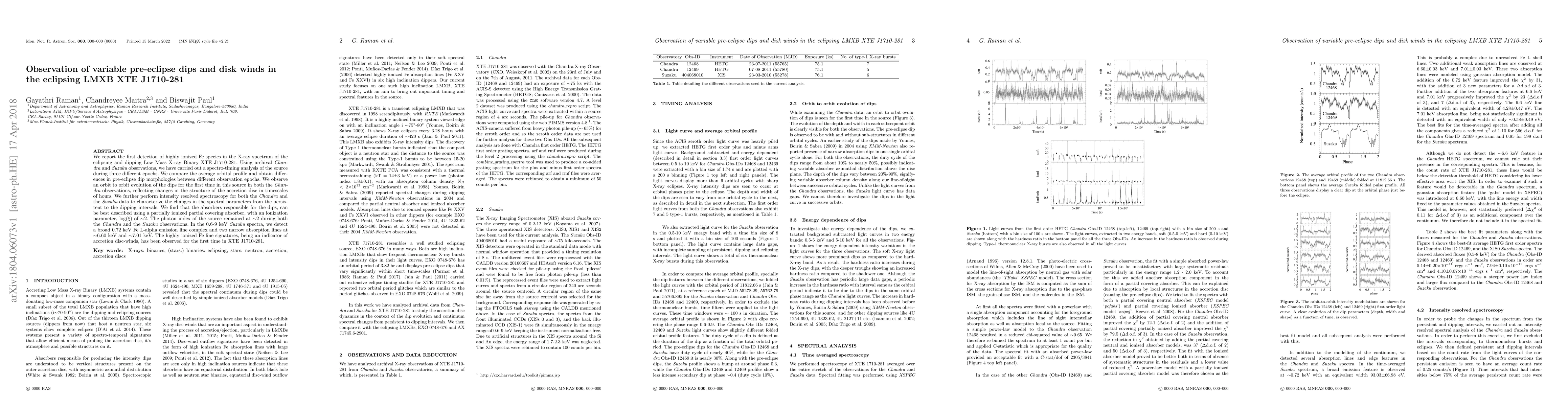 We report the first detection of highly ionized Fe species in the X-ray spectrum of the eclipsing and dipping Low Mass X-ray Binary XTE J1710-281. Using archival Chandra and Suzaku observations, we have carried out a spectro-timing analysis of the source during three different epochs. We compare the average orbital profile and obtain differences in pre-eclipse dip morphologies between different observation epochs. We observe an orbit to orbit evolution of the dips for the first time in this source in both the Chandra observations, reflecting changes in the structure of the accretion disc in timescales of hours. We further perform intensity resolved spectroscopy for both the Chandra and the Suzaku data to characterize the changes in the spectral parameters from the persistent to the dipping intervals. We find that the absorbers responsible for the dips, can be best described using a partially ionized partial covering absorber, with an ionization parameter, log($\xi$) of $\sim$2. The photon index of the source remained at $\sim$2 during both the Chandra and the Suzaku observations. In the 0.6-9 keV Suzaku spectra, we detect a broad 0.72 keV Fe L-alpha emission line complex and two narrow absorption lines at $\sim$6.60 keV and $\sim$7.01 keV. The highly ionized Fe line signatures, being an indicator of accretion disc-winds, has been observed for the first time in XTE J1710-281.