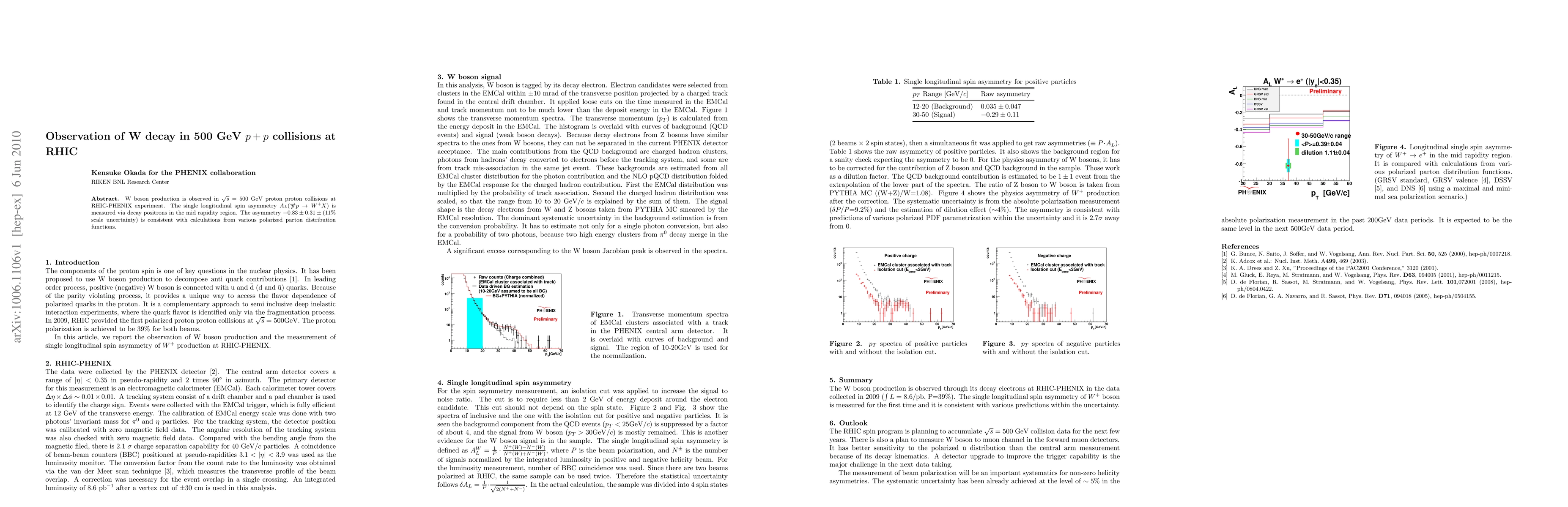 Researchers at RHIC-PHENIX experiment observed W boson production in 500 GeV proton collisions and measured a single longitudinal spin asymmetry consistent with calculations from various parton distribution functions.