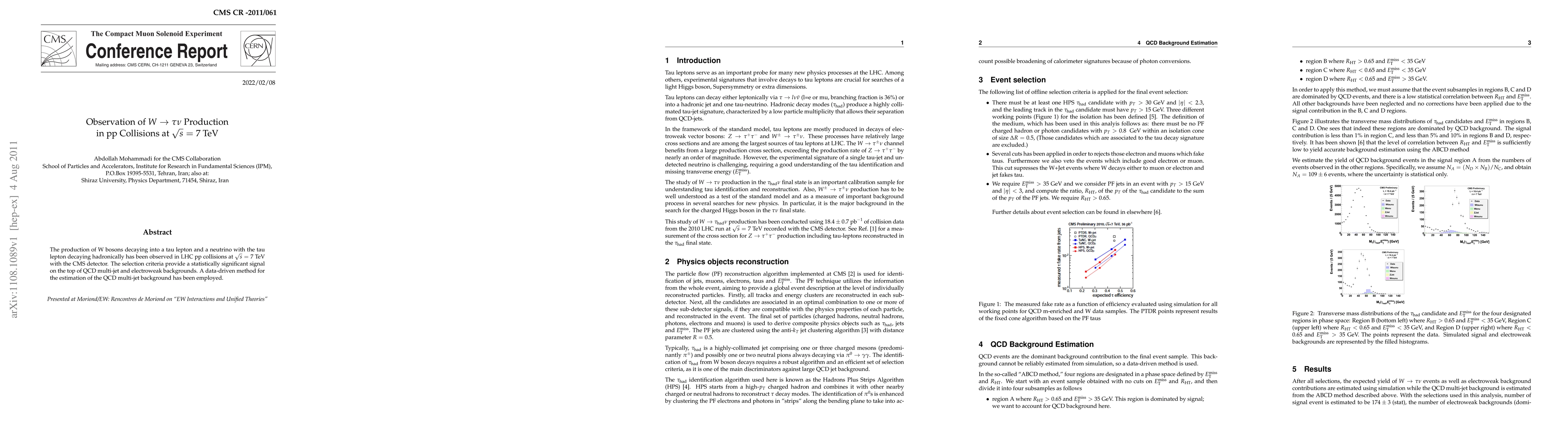 Summary: The CMS detector at the LHC observed W bosons decaying into a hadronically decaying tau lepton and a neutrino in proton-proton collisions at 7 TeV. A data-driven method was used to estimate the QCD multi-jet background, achieving a statistically significant signal.