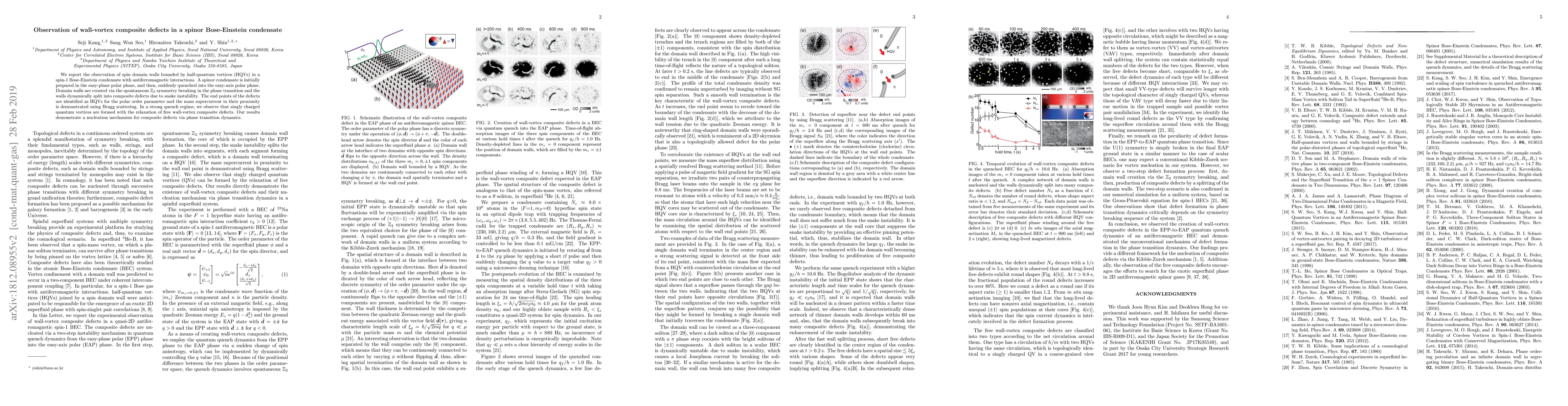This paper observes spin domain walls bounded by half-quantum vortices in a spin-1 Bose-Einstein condensate undergoing a phase transition from easy-plane to easy-axis polar phases, demonstrating a nucleation mechanism for composite defects via snake instability and quantum vortex formation.