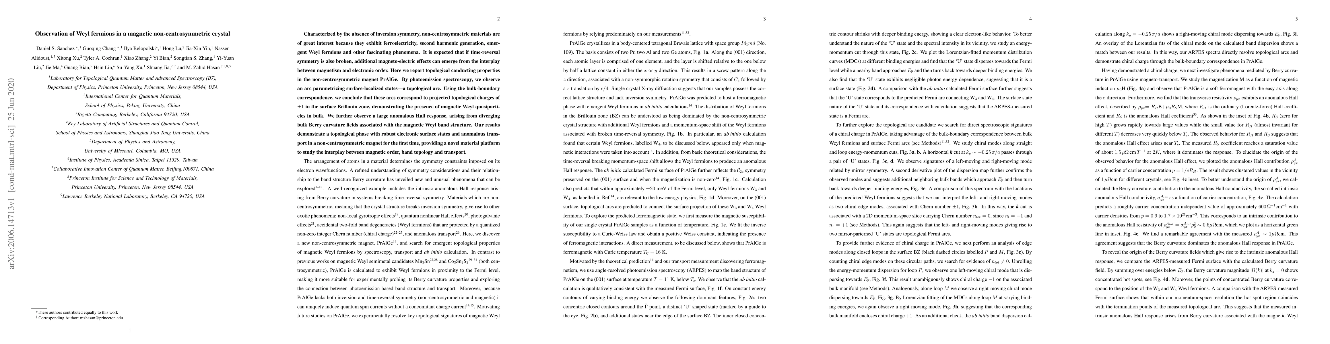 This paper reports the observation of Weyl fermions in the magnetic non-centrosymmetric crystal PrAlGe using photoemission spectroscopy, revealing topological surface states and a large anomalous Hall response. The findings highlight a novel topological phase with significant implications for studying the interplay between magnetism, band topology, and transport.