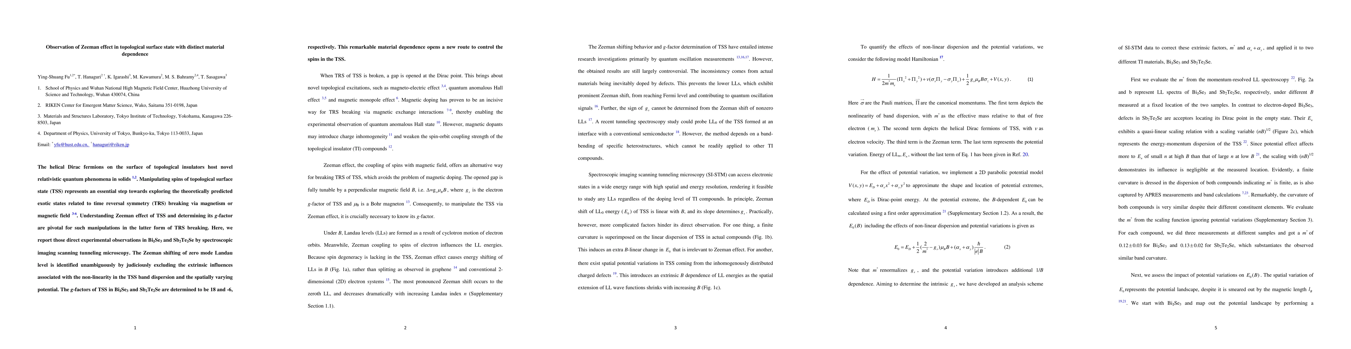 The helical Dirac fermions on the surface of topological insulators host novel relativistic quantum phenomena in solids. Manipulating spins of topological surface state (TSS) represents an essential step towards exploring the theoretically predicted exotic states related to time reversal symmetry (TRS) breaking via magnetism or magnetic field. Understanding Zeeman effect of TSS and determining its g-factor are pivotal for such manipulations in the latter form of TRS breaking. Here, we report those direct experimental observations in Bi2Se3 and Sb2Te2Se by spectroscopic imaging scanning tunneling microscopy. The Zeeman shifting of zero mode Landau level is identified unambiguously by judiciously excluding the extrinsic influences associated with the non-linearity in the TSS band dispersion and the spatially varying potential. The g-factors of TSS in Bi2Se3 and Sb2Te2Se are determined to be 18 and -6, respectively. This remarkable material dependence opens a new route to control the spins in the TSS.