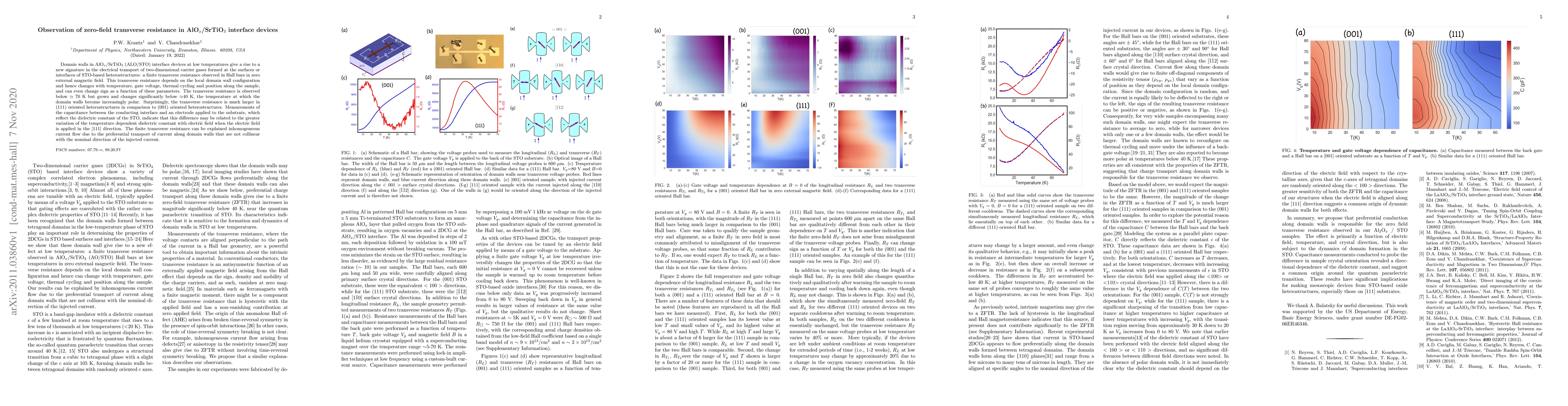 This study observes a finite transverse resistance in zero-field conditions in AlO$_x$/SrTiO$_3$ interface devices, primarily due to domain walls influencing the electrical transport of two-dimensional carrier gases. This resistance varies with temperature, gate voltage, and orientation of the heterostructure, suggesting a complex relationship with the dielectric properties of the material.