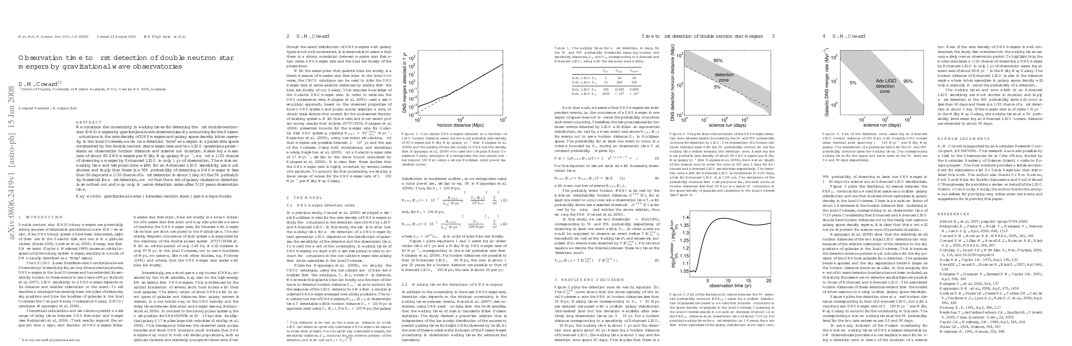 This study estimates the waiting time for detecting the first double neutron star mergers by gravitational wave observatories, finding a 95% probability of detection within 60 days for Advanced LIGO, and a 1/20 chance of observing a merger in just 1 day. The effect of galaxy clusters is minimal in the short term but may influence detection rates over longer observation periods.