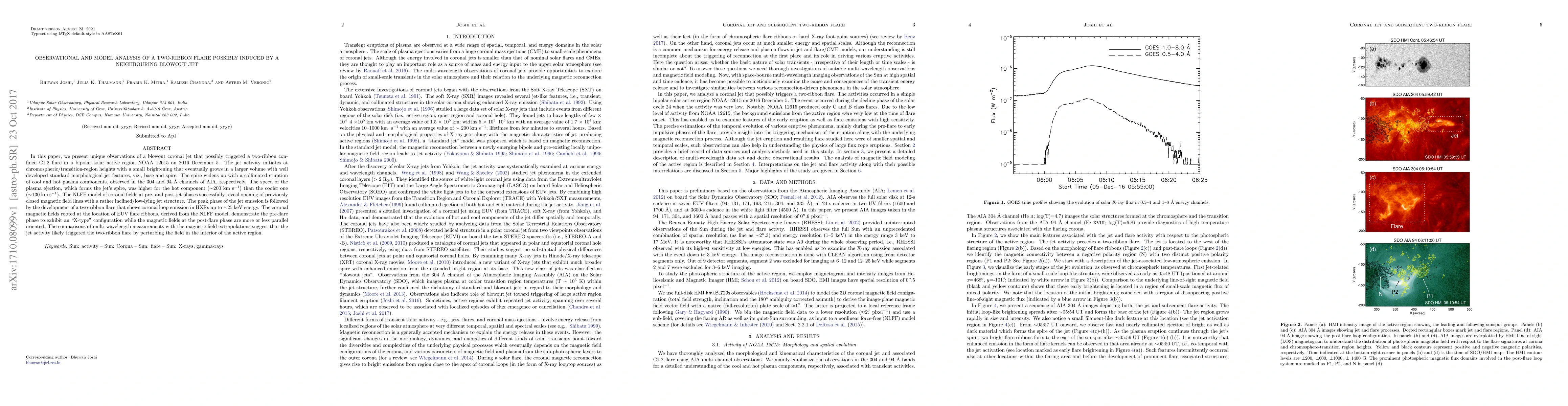 In this paper, we present unique observations of a blowout coronal jet that possibly triggered a two-ribbon confined C1.2 flare in a bipolar solar active region NOAA 12615 on 2016 December 5. The jet activity initiates at chromospheric/transition-region heights with a small brightening that eventually grows in a larger volume with well developed standard morphological jet features, viz., base and spire. The spire widens up with a collimated eruption of cool and hot plasma components, observed in the 304 and 94 A channels of AIA, respectively. The speed of the plasma ejection, which forms the jet's spire, was higher for the hot component (~200 km/s) than the cooler one (~130 km/s). The NLFF model of coronal fields at pre- and post-jet phases successfully reveal opening of previously closed magnetic field lines with a rather inclined/low-lying jet structure. The peak phase of the jet emission is followed by the development of a two-ribbon flare that shows coronal loop emission in HXRs up to ~25 keV energy. The coronal magnetic fields rooted at the location of EUV flare ribbons, derived from the NLFF model, demonstrate the pre-flare phase to exhibit an "X-type" configuration while the magnetic fields at the post-flare phase are more or less parallel oriented. The comparisons of multi-wavelength measurements with the magnetic field extrapolations suggest that the jet activity likely triggered the two-ribbon flare by perturbing the field in the interior of the active region.