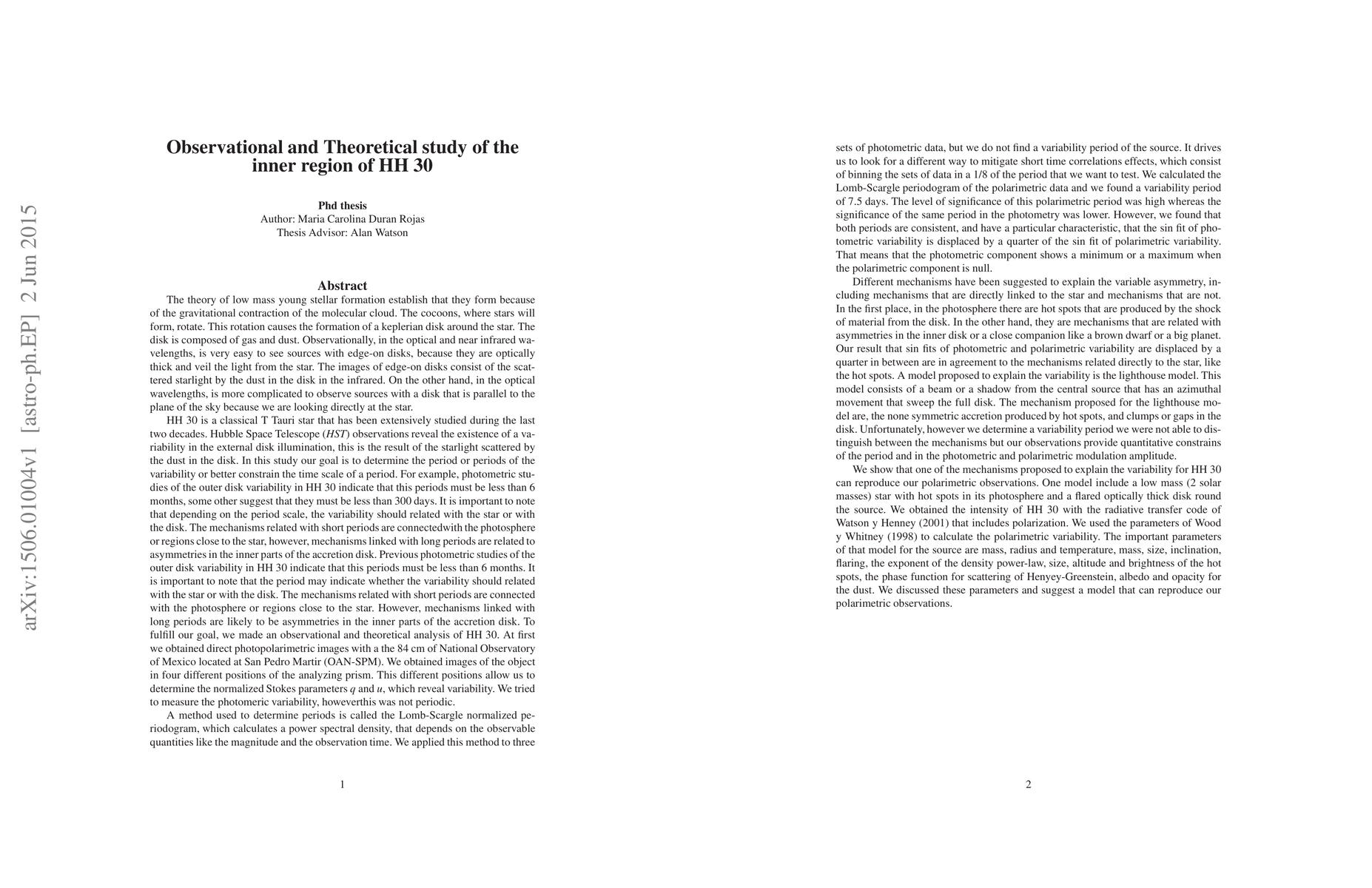 HH 30 is a T Tauri star. In this thesis photometric and polarimetric observations through the source are reported. The observations were carried out using the 84cm telescope of the National Observatory of Mexico (OAN-SPM). This thesis also present a model of the brightness of the source using a Monte Carlo code of Watson and Henney (2001) that solves the radiative transfer equation. I modified this code in order to include the polarization. I used the parameters of Wood y Whitney (1998) to calculate the polarimetric variability observed in HH 30.