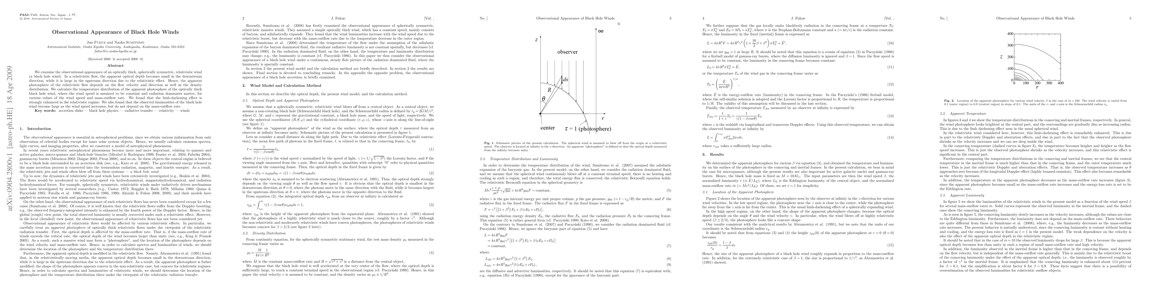 We examine the observational appearance of an optically thick, spherically symmetric, relativistic wind (a black hole wind). In a relativistic flow, the apparent optical depth becomes small in the downstream direction, while it is large in the upstream direction due to the relativistic effect. Hence, the apparent photosphere of the relativistic flow depends on the flow velocity and direction as well as the density distribution. We calculate the temperature distribution of the apparent photosphere of the optically thick black hole wind, where the wind speed is assumed to be constant and radiation dominates matter, for various values of the wind speed and mass-outflow rate. We found that the limb-darkening effect is strongly enhanced in the relativistic regime. We also found that the observed luminosities of the black hole wind become large as the wind speed increases, but do not depend on the mass-outflow rate.