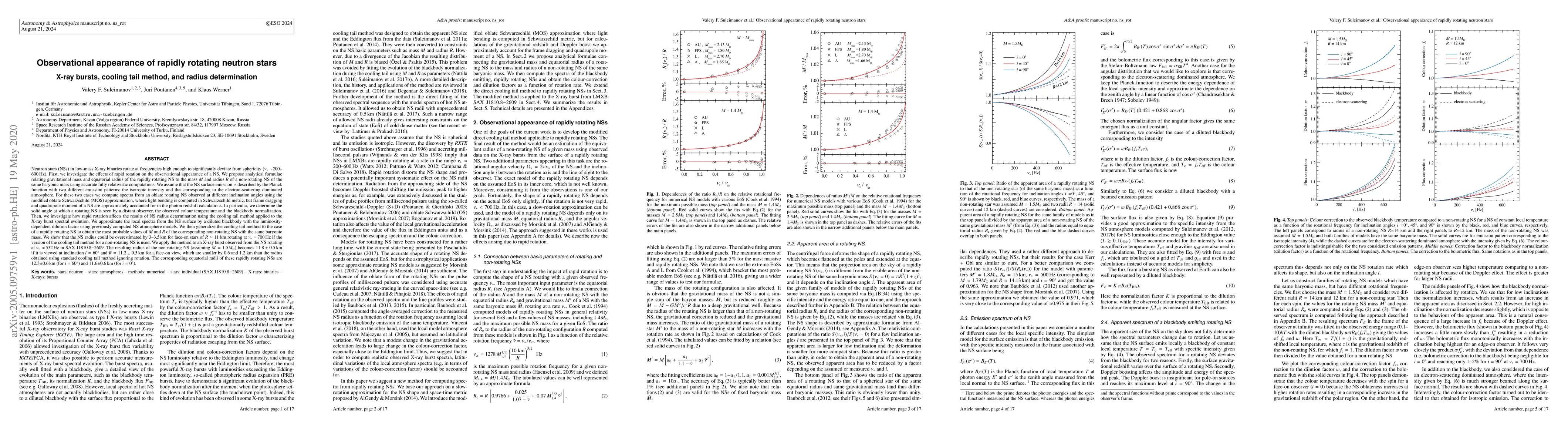 Neutron stars (NSs) in low-mass X-ray binaries rotate at frequencies high enough to significantly deviate from sphericity ($\nu_* \sim$ 200--600 Hz). We investigate the effects of rapid rotation on the observational appearance of a NS. We propose analytical formulae relating gravitational mass and equatorial radius of the rapidly rotating NS to the mass $M$ and radius $R$ of a non-rotating NS of the same baryonic mass using accurate fully relativistic computations. We compute spectra from an oblate rotating NS observed at different inclination angles using the modified oblate Schwarzschild (MOS) approximation, where light bending is computed in Schwarzschild metric, but frame dragging and quadrupole moment of a NS are approximately accounted for in the photon redshift calculations. We generalize the cooling tail method to the case of a rapidly rotating NS to obtain the most probable values of $M$ and $R$ of the corresponding non-rotating NS with the same baryonic mass. We approximate the local spectra from the NS surface by a diluted blackbody using previously computed NS atmosphere models. We show that the NS radius could be overestimated by 3--3.5 km for face-on stars of $R\approx 11$ km rotating at $\nu_* =$ 700 Hz if the version of the cooling tail method for a non-rotating NS is used. We apply the method to an X-ray burst observed from the NS rotating at $\nu_* \approx$ 532 Hz in SAX J1810.8$-$2609. The resulting radius of the non-rotating NS (assuming $M=1.5 M_\odot$) becomes $11.8\pm0.5$ km if it is viewed at inclination i=60 deg and $R=11.2\pm0.5$ km for a face-on view, which are smaller by 0.6 and 1.2 km than the radius obtained using standard cooling tail method ignoring rotation. The corresponding equatorial radii of these rapidly rotating NSs are 12.3$\pm 0.6$ km (for i=60 deg) and 11.6$\pm 0.6$\,km (for i=0 deg).