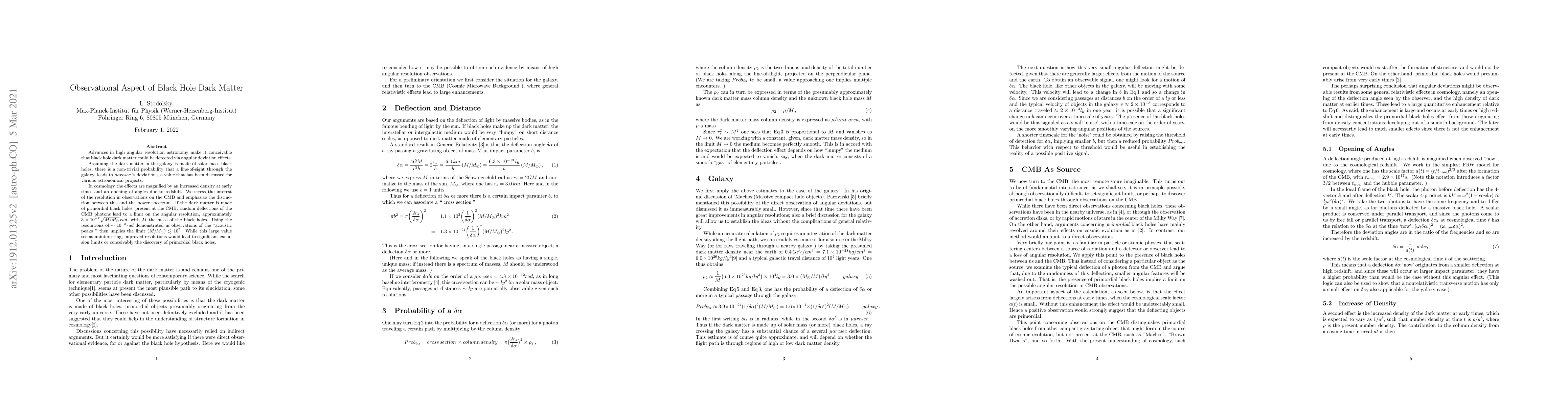 Advances in high angular resolution astronomy make it conceivable that black hole dark matter could be detected via angular deviation effects. Assuming the dark matter in the galaxy is made of solar mass black holes, there is a non-trivial probability that a line-of-sight through the galaxy, leads to micro-arcseconds deviations, a value that has been discussed for various astronomical projects. In cosmology the effects are magnified by an increased density at early times and an opening of angles due to redshift. If the dark matter is made of primordial black holes, present at the CMB, random deflections of the CMB photons lead to a limit on the angular resolution, approximately ${3}\times 10^{-7} \sqrt{M/M_\odot}\, rad$, with $M$ the mass of the black holes. Using the resolutions of $\sim 10^{-3} rad$ demonstrated in observations of the "acoustic peaks" then implies the limit $(M/M_\odot)\lesssim 10^{7}$. While this large value seems uninteresting, improved resolutions would lead to significant limits or conceivably the discovery of primordial black holes.
