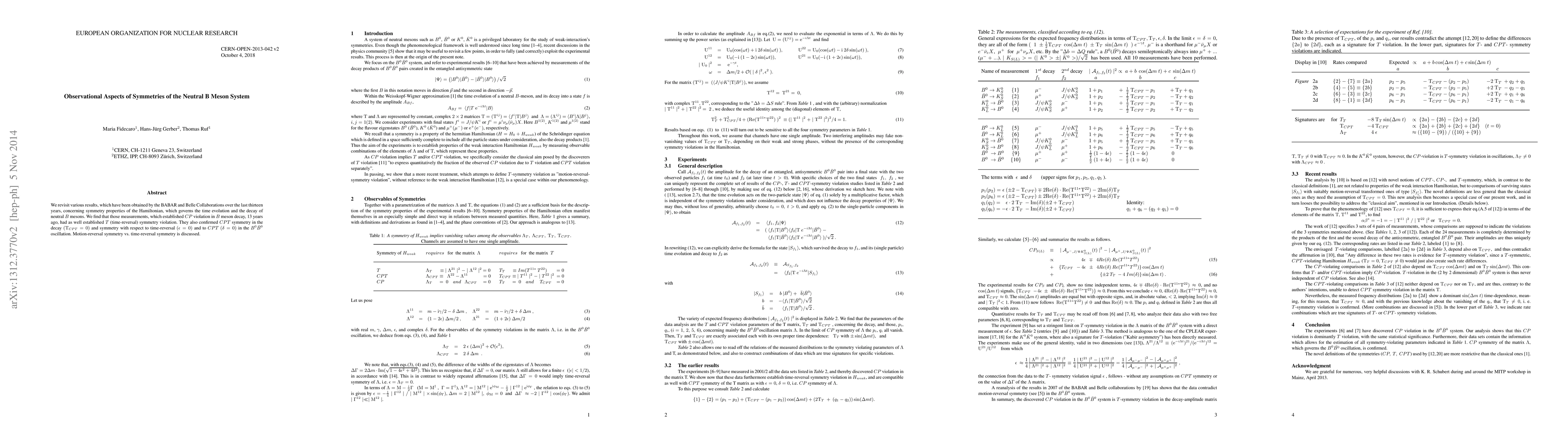 We revisit various results, which have been obtained by the BABAR and Belle Collaborations over the last twelve years, concerning symmetry properties of the Hamiltonian, which governs the time evolution and the decay of neutral B mesons.We find that those measurements, which established CP violation in B meson decay, 12 years ago, had as well established T (time-reversal) symmetry violation. They also confirmed CPT symmetry in the decay (T_CPT = 0) and symmetry with respect to time-reversal (epsilon? = 0) and to CPT (delta? = 0) in the B0 ?B0bar oscillation.