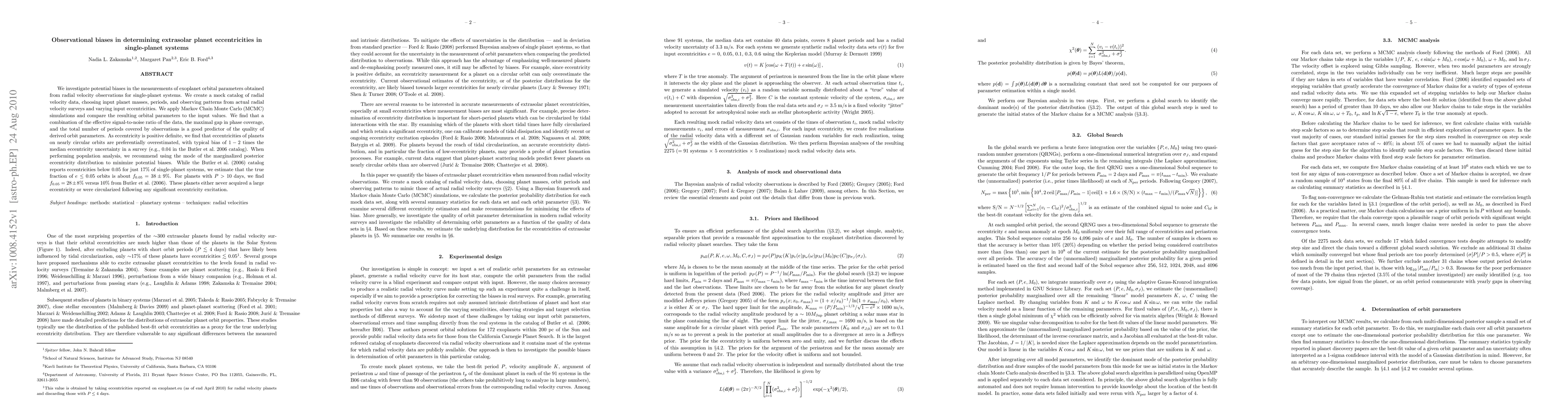 We investigate potential biases in the measurements of exoplanet orbital parameters obtained from radial velocity observations for single-planet systems. We create a mock catalog of radial velocity data, choosing input planet masses, periods, and observing patterns from actual radial velocity surveys and varying input eccentricities. We apply Markov Chain Monte Carlo (MCMC) simulations and compare the resulting orbital parameters to the input values. We find that a combination of the effective signal-to-noise ratio of the data, the maximal gap in phase coverage, and the total number of periods covered by observations is a good predictor of the quality of derived orbit parameters. As eccentricity is positive definite, we find that eccentricities of planets on nearly circular orbits are preferentially overestimated, with typical bias of 1-2 times the median eccentricity uncertainty in a survey (e.g., 0.04 in the Butler et al. 2006 catalog). When performing population analysis, we recommend using the mode of the marginalized posterior eccentricity distribution to minimize potential biases. While the Butler et al. (2006) catalog reports eccentricities below 0.05 for just 17% of single-planet systems, we estimate that the true fraction of e < 0.05 orbits is about f(0.05)=38\pm 9%. For planets with P > 10 days, we find f(0.05)=28\pm 8% versus 10% from Butler et al. (2006). These planets either never acquired a large eccentricity or were circularized following any significant eccentricity excitation.