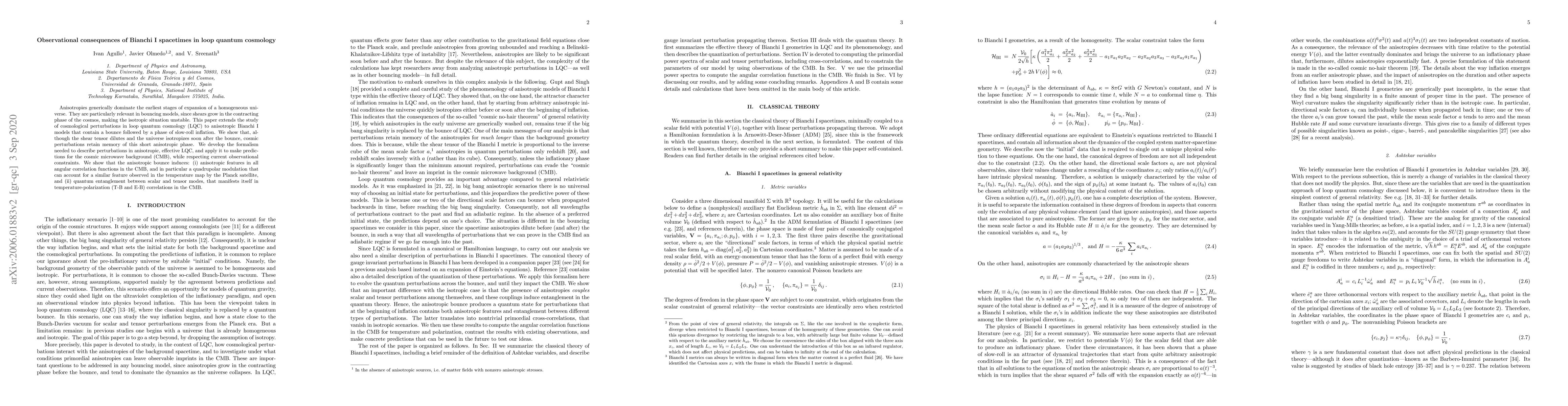 This paper investigates anisotropic Bianchi I spacetimes in loop quantum cosmology, showing that perturbations retain memory of an initial anisotropic phase post-bounce. The study predicts anisotropic features in the CMB and quantum entanglement between scalar and tensor modes, potentially explaining observed quadrupolar modulations and temperature-polarization correlations.