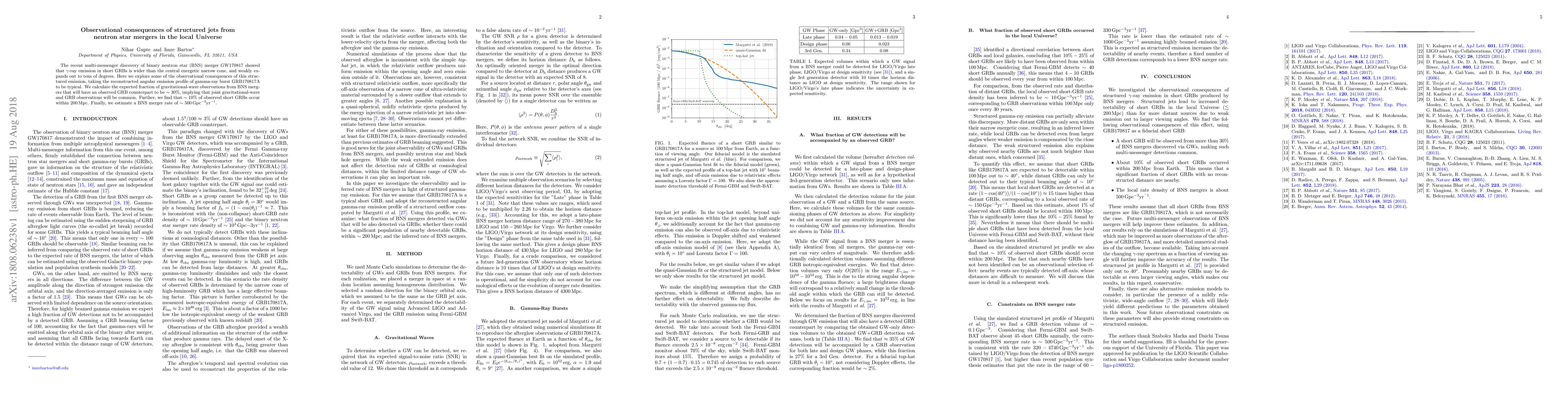 This study explores observational consequences of structured jets from neutron star mergers, finding that about 30% of gravitational-wave observations from BNS mergers are expected to have an observed GRB counterpart. It also estimates that 10% of observed short GRBs occur within 200 Mpc and suggests a BNS merger rate of ~500 Gpc$^{-3}$yr$^{-1}$.