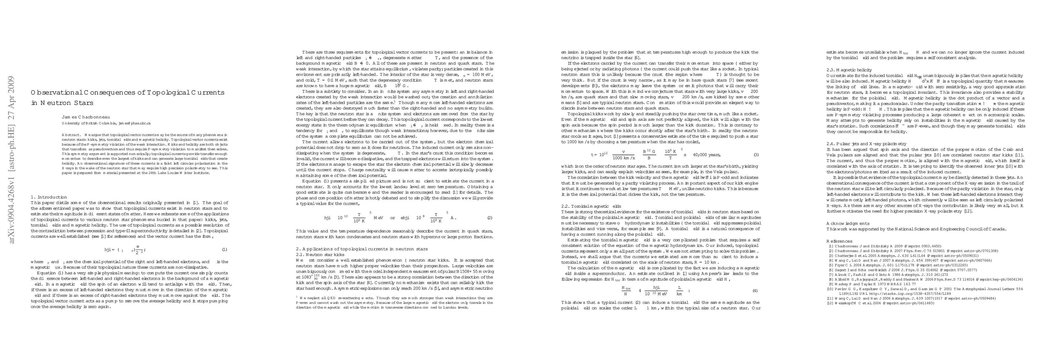 We argue that topological vector currents may be the source of many phenomena in neutron stars: kicks, jets, toroidal fields and magnetic helicity. Topological vector currents exist because of the P-symmetry violation of the weak interaction. Kicks and helicity are both objects that transform as pseudovectors and thus require P-symmetry violation to manifest themselves. This symmetry argument is supported numerically; topological currents provide transfer enough momentum to describe even the largest of kicks and can generate large toroidal fields that create helicity. An observational signature of currents is a faint left circular polarization in the X-rays in the wake of the neutron star that may require high precision polarimetry to see.