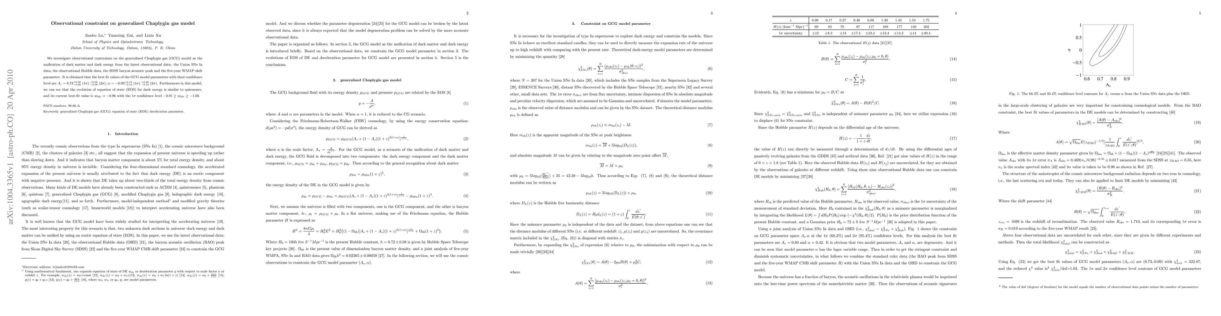This paper examines observational constraints on the generalized Chaplygin gas model, finding best fit values for its parameters and showing that its dark energy equation of state closely resembles quiessence, with a current best-fit value of $w_{0de}=-0.96$ within a $1\sigma$ confidence interval.