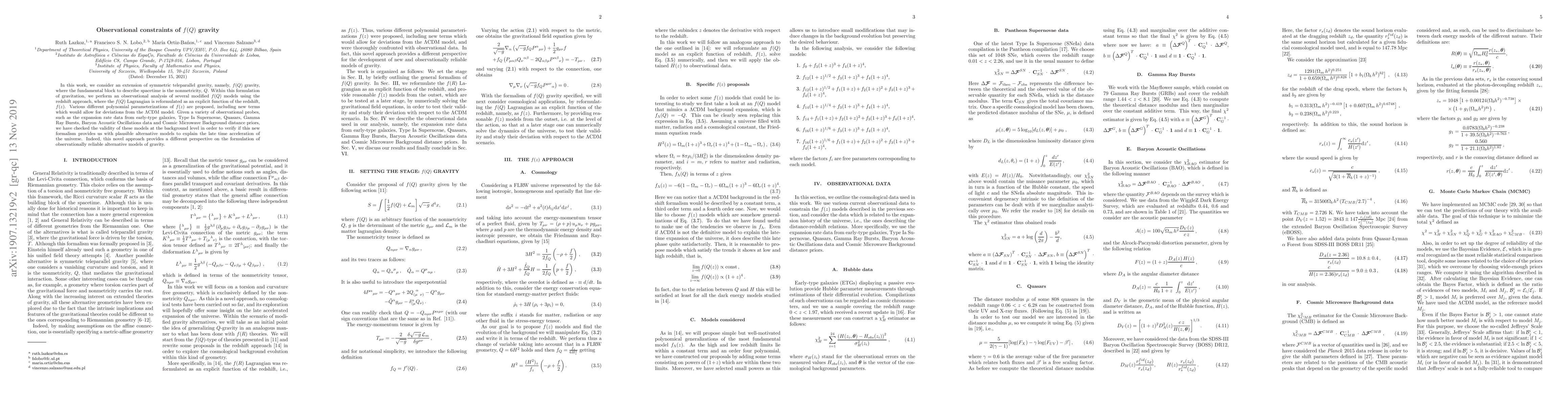 This paper explores $f(Q)$ gravity, an extension of symmetric teleparallel gravity based on nonmetricity, and conducts an observational analysis of various $f(Q)$ models using redshift data. The study finds that these models, including new terms, can provide plausible alternatives to the $\Lambda$CDM model for explaining the universe's late-time acceleration.